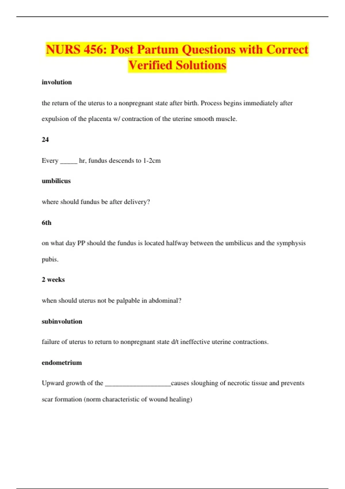 NURS 456: Post Partum Questions with Correct Verified Solutions