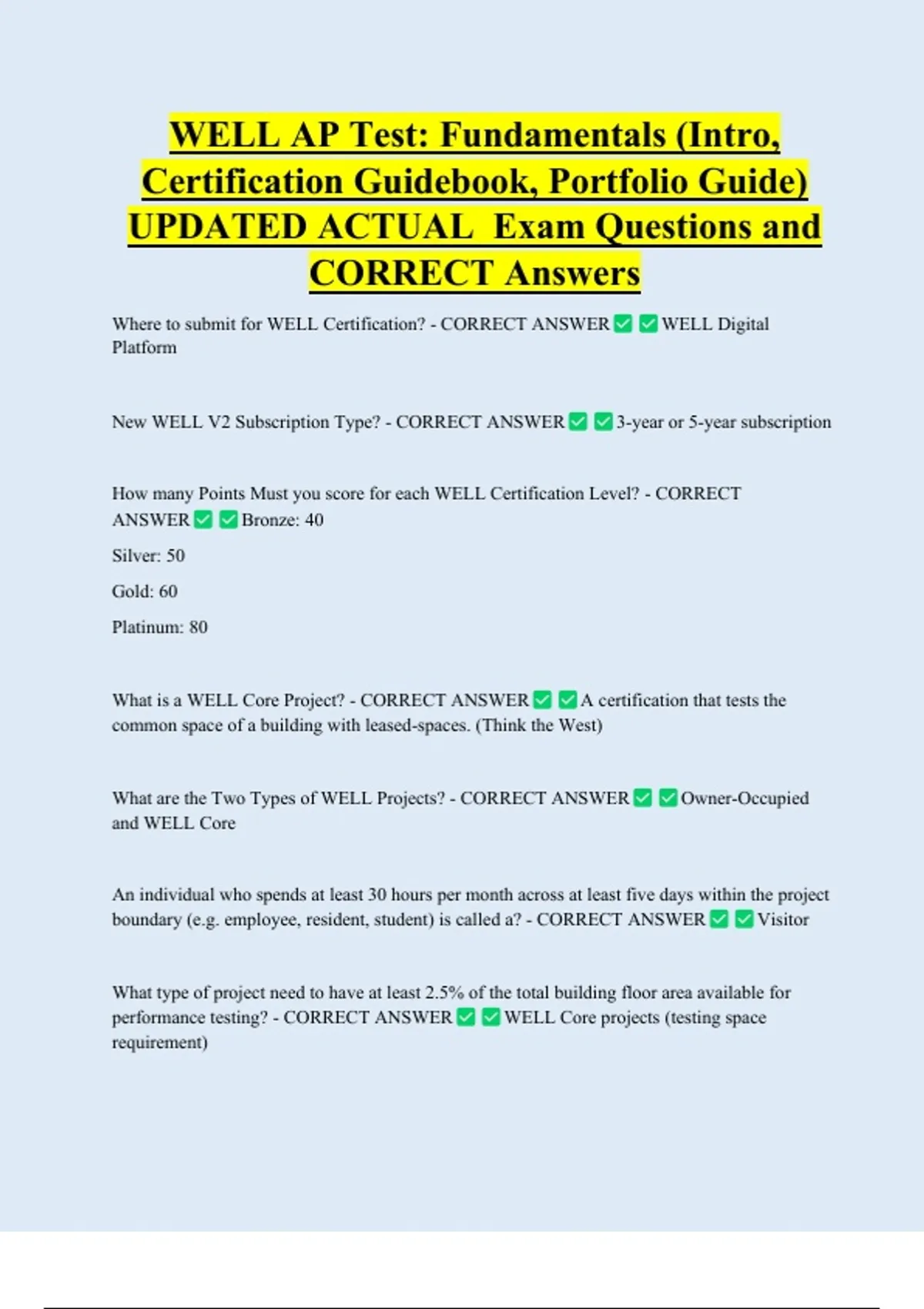 WELL AP Test: Fundamentals (Intro, Certification Guidebook, Portfolio Guide) UPDATED ACTUAL Exam Questions and CORRECT Answers Where to submit for WELL Certification? - CORRECT ANSWER Platform New WELL V2 Subscription Type? - CORRECT ANSWER WELL Digital 3-year or 5-year subscription How many Points Must you score for each WELL Certification Level? - CORRE