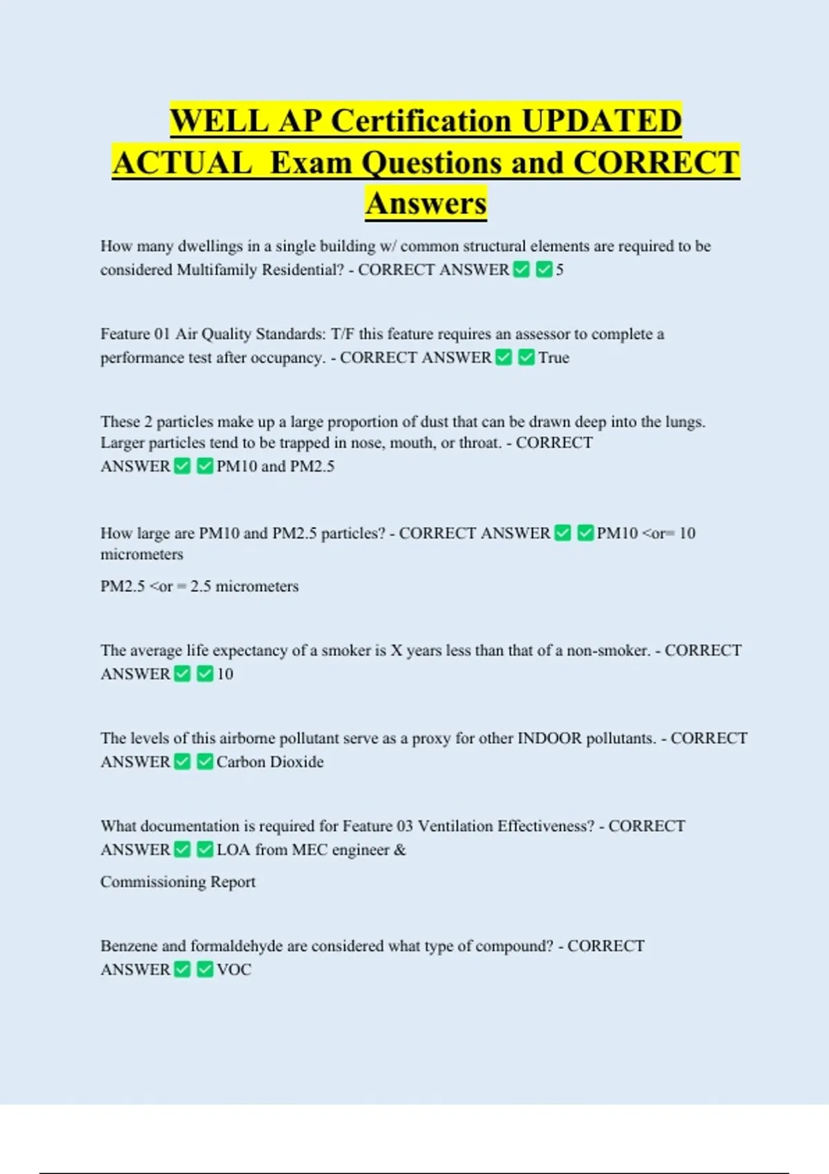 WELL AP Certification UPDATED ACTUAL Exam Questions and CORRECT Answers How many dwellings in a single building w/ common structural elements are required to be considered Multifamily Residential? - CORRECT ANSWER 5 Feature 01 Air Quality Standards: T/F this feature requires an assessor to complete a performance test after occupancy. - CORRECT ANSWER True These 2 particles make up a large proportion of dust that can be drawn deep into the lungs. Larger particles tend to be trapped in nose, mouth, or throat. - CORRECT ANSWER PM10 and PM