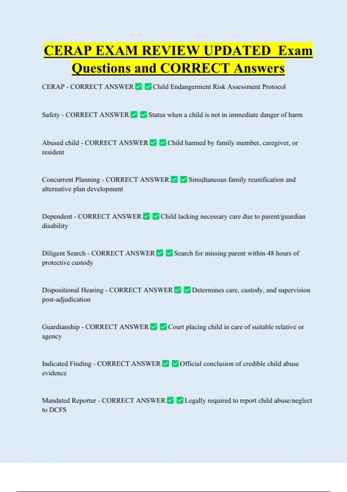 CERAP EXAM REVIEW UPDATED Exam Questions and CORRECT Answers CERAP - CORRECT ANSWER Safety - CORRECT ANSWER Abused child - CORRECT ANSWER resident Child Endangerment Risk Assessment Protocol Status when a child is not in immediate danger of harm Child harmed by family member, caregiver, or Concurrent Planning - CORRECT ANSWER alternative plan development Dependent - CORRECT ANSWER Simultaneous family reunification an