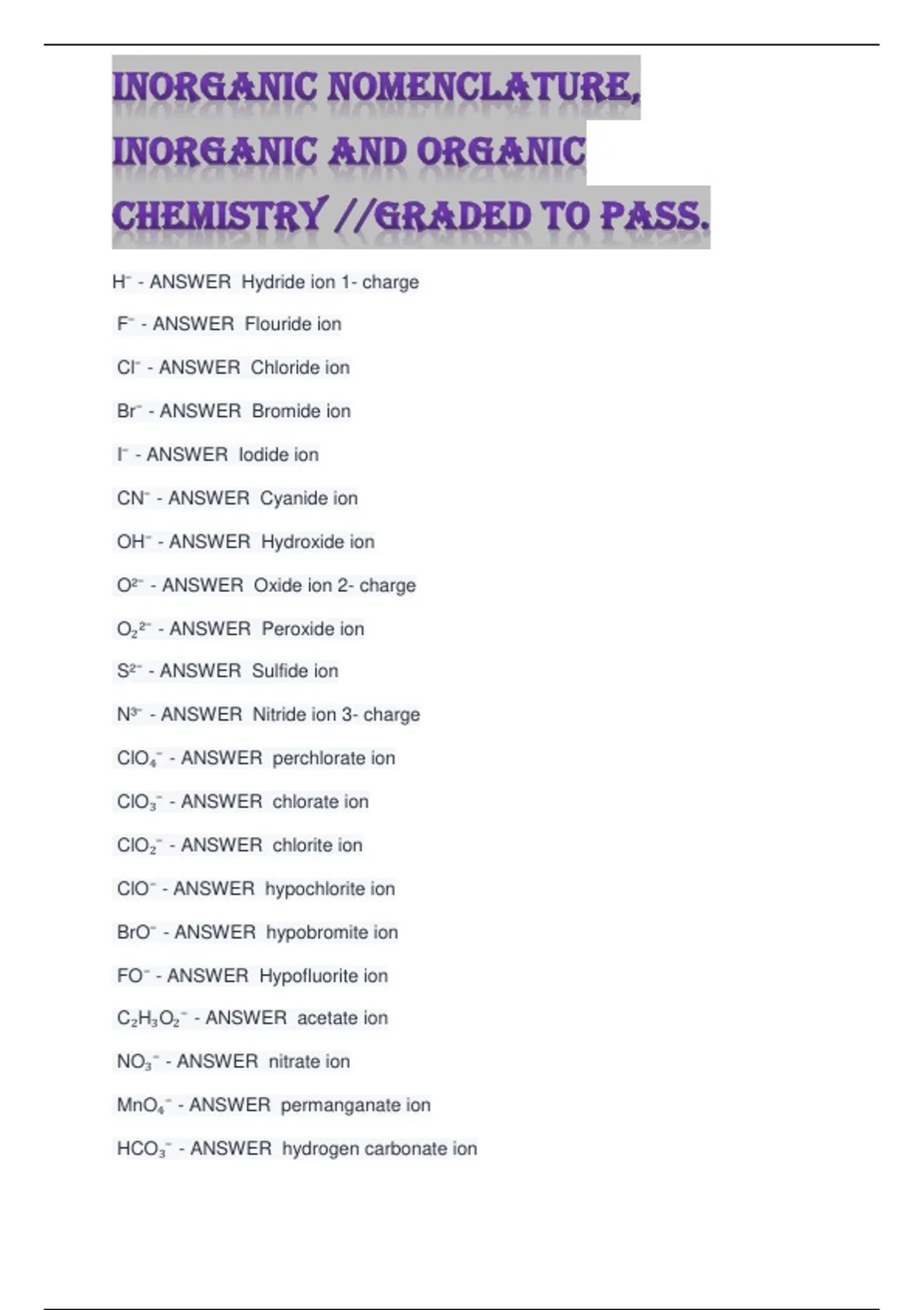 Cl⁻ - ANSWER Chloride ion