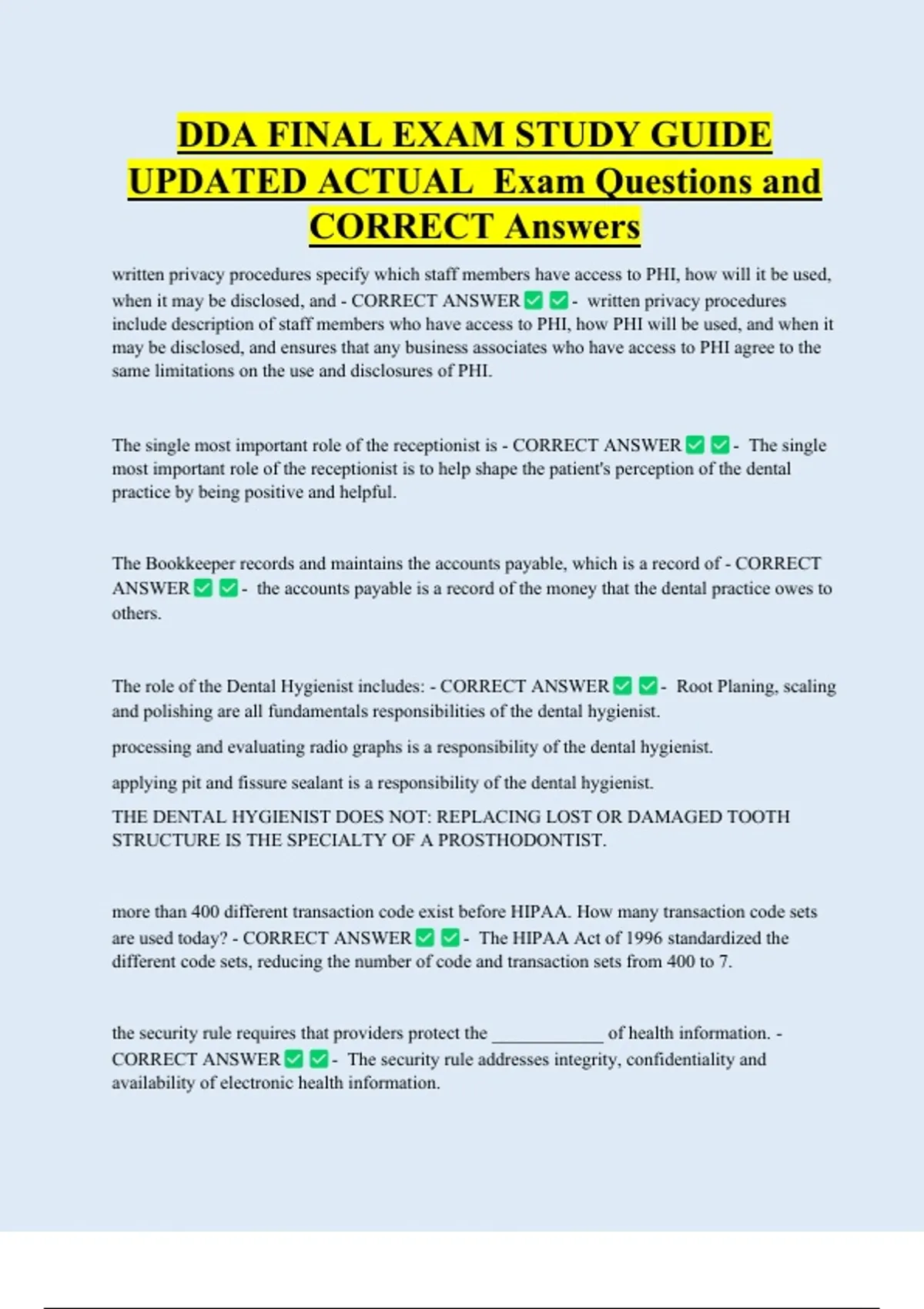 DDA FINAL EXAM STUDY GUIDE UPDATED ACTUAL Exam Questions and CORRECT Answers