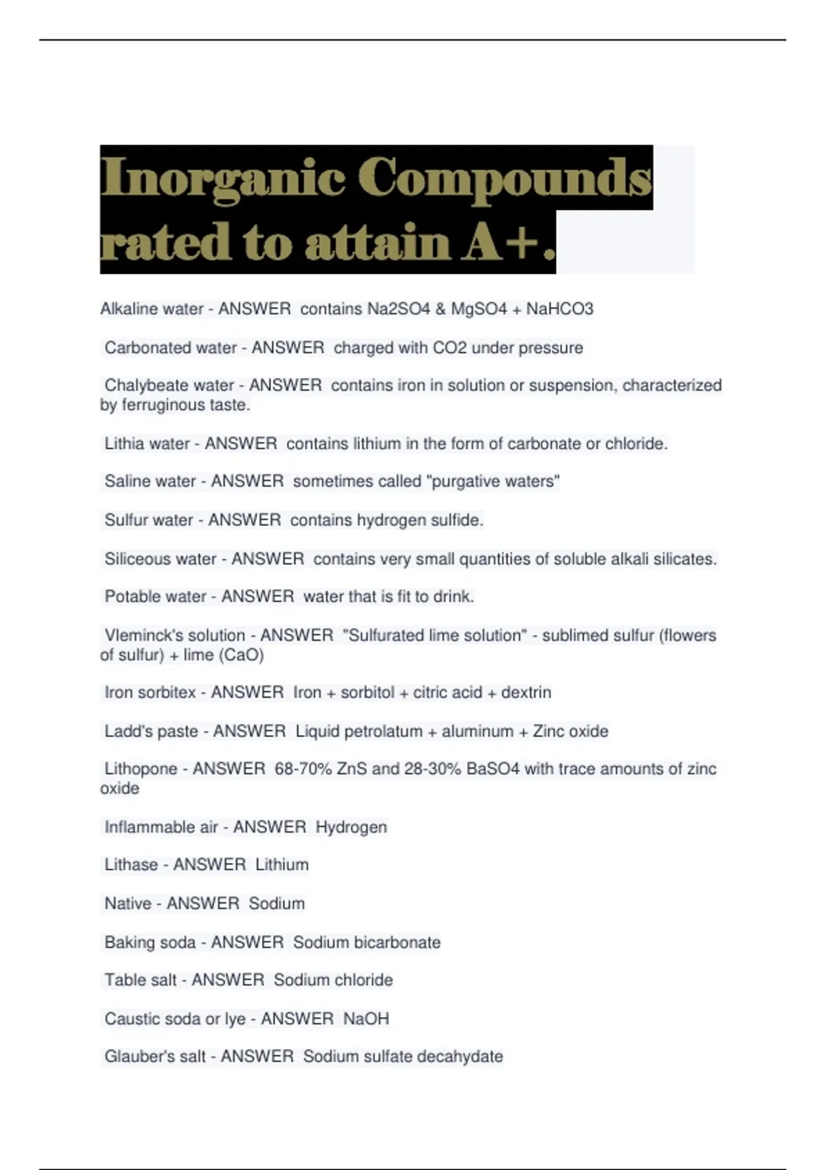 Alkaline water - ANSWER contains Na2SO4 & MgSO4 + NaHCO3 Carbonated water - ANSWER charged with CO2 under pressure Chalybeate water - ANSWER contains iron in solution or suspension, characterized by ferruginous taste. Lithia water - ANSWER contains lithium in the form of carbonate or chloride. Saline water - ANSWER sometimes called "purgative waters" Sulfur water - ANSWER contains hydrogen sulfide. Siliceous water - ANSWER contains very small quantities of soluble alkali silicates. Potable water - ANSWER water that is fit to drink. Vleminck's solution - ANSWER "Sulfurated lime solution" - sublimed sulfur (flowers of sulfur) + lime (CaO) Iron sorbitex - ANSWER Iron + sorbitol + citric acid + dextrin Ladd's paste - ANSWER Liquid petrolatum + aluminum + Zinc oxide Lithopone - ANSWER 68-70% ZnS and 28-30% BaSO4 with trace amounts of zinc oxide Inflammable air - ANSWER Hydrogen