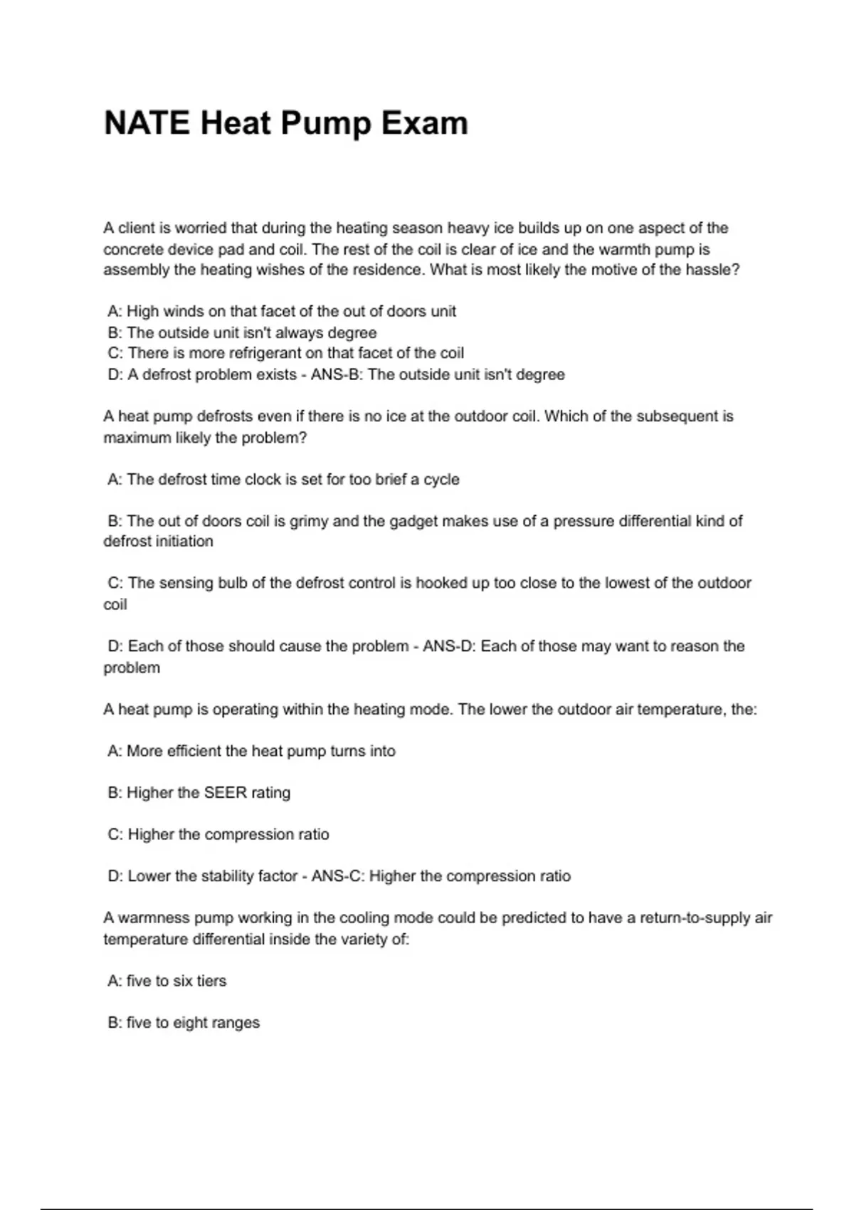 D: A defrost problem exists - ANS-B: The outside unit isn't degree