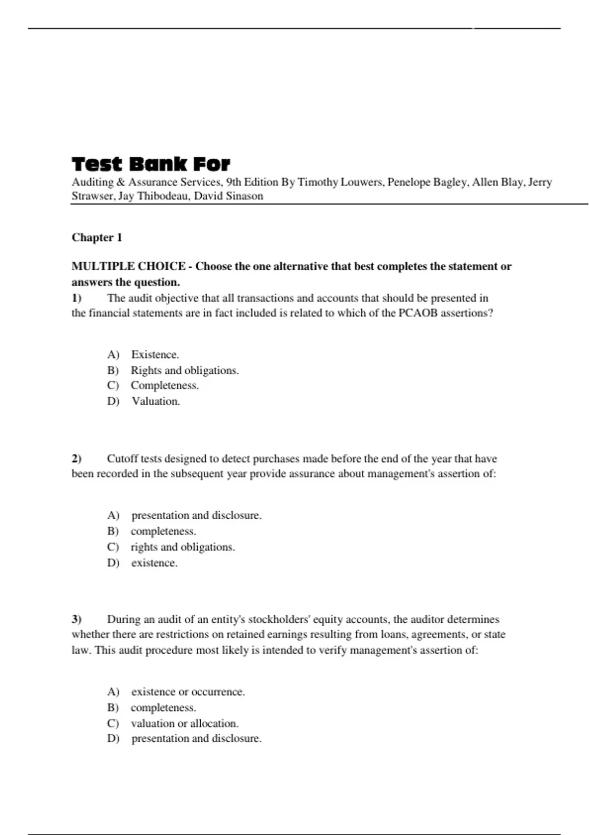 Test Bank For Auditing and Assurance Services 9th Edition By Timothy Louwers Penelope Bagley Veri