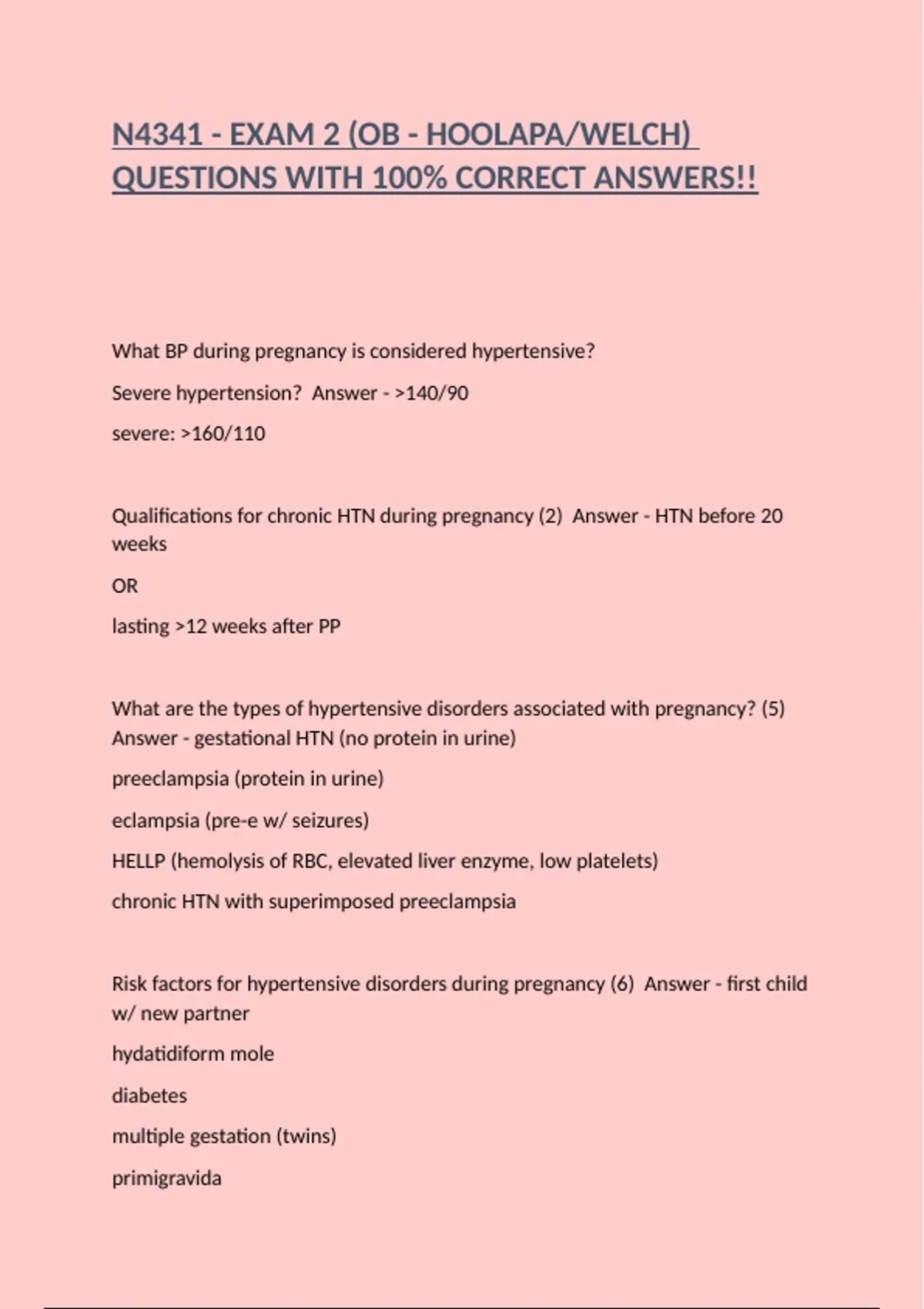 N4341 - EXAM 2 (OB - HOOLAPA/WELCH) QUESTIONS WITH 100% CORRECT ANSWERS!!