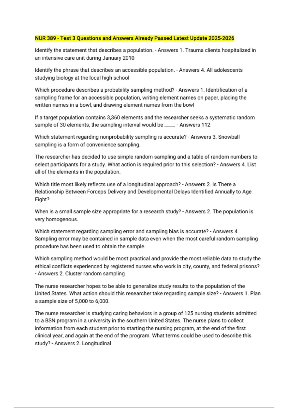 NUR 389 - Test 3 Questions and Answers Already Passed Latest Update Identify the statement that describes a population. - Answers 1. Trauma clients hospitalized in an intensive care unit during January 2010 Identify the phrase that describes an accessible population. - Answers 4. All adolescents studying biology at the local high school Which procedure describes a probability sampling method? - Answers 1. Identification of a sampling frame for an accessible population, writing element names on paper, placing the written names in a bowl, and drawing element names from the bowl If a target population contains 3,360 elements and the researcher seeks a systematic random sample of 30 elements, the sampling interval would be ____. - Answers 112 Which statement regarding nonprobability sampling is accurate? - Answers 3. Snowball sampling is a form of convenience sampling. The researcher has decided to use simple random sampling and a table of random numbers to select participants for a study. What action is required prior to this selection? - Answers 4. List all of the elements in the population. Which title most likely reflects use of a longitudinal approach? - Answers 2. Is There a Relationship Between Forceps Delivery and Developmental Delays Identified Annually to Age Eight? When is a small sample size appropriate for a research study? - Answers 2. The population is very homogenous. Which statement regarding sampling error and sampling bias is accurate? - Answers 4. Sampling error may be contained in sample data even when the most careful random sampling procedure has been used to obtain the sample. Which sampling method would be most practical and provide the most reliable data to study the ethical conflicts experienced by registered nurses who work in city, county, and federal prisons? - Answers 2. Cluster random sampling The nurse researcher hopes to be able to generalize study results to the population of the United States. What action should this researcher take regarding sample size? - Answers 1. Plan a sample size of 5,000 to 6,000. The nurse researcher is studying caring behaviors in a group of 125 nursing students admitted to a BSN program in a university in the southern United States. The nurse plans to collect information from each student prior to starting the nursing program, at the end of the first clinical year, and again at the end of the program. What terms could be used to describe this study? - Answers 2. Longitudinal 4. Cohort The nurse is reading a research report and notices that the stated N for the study is 95. In the reports section, data are provided for 87 subjects. What is the most important question for the reader to ask about this study? - Answers 3. How is dropout handled in the study? Which group represents a convenience sample? - Answers 1. The students seen in the University Health Clinic on one afternoon in May The study design proposes advertising in the local newspaper to attract subjects for a study. The subjects would be paid $75 for their participation in the study. How should the nurse interpret this plan? - Answers 4. The results of this study may not be generalizable. The nurse researcher plans to use systematic random sampling to determine participants in a study. Which components are necessary to begin this selection? - Answers 1. Population list 2. Sampling interval 3. Random starting point A nurse researcher is considering using convenience sampling to choose participants in a study. The researcher must be prepared to accept which disadvantages of this sampling method? - Answers 3. Results may have limited generalizability. 5. The method usually results in a biased sample. The researcher asks another nurse to use a study instrument to score a questionnaire completed by study participants. The researcher has previously used the instrument to score the questionnaire and will compare the two results. Which type of reliability is this researcher trying to establish? - Answers 4. Equivalence A researcher is developing a data collection instrument to measure nurses' attitudes about their working conditions. A draft copy of the instrument is sent to 20 nurse clinicians to critique and provide feedback. What is the researcher attempting to establish by using this strategy? - Answers 3. Content validity A nurse is completing a questionnaire that asks for the nurse's area of specialization in nursing (Peds, OB, Med Surg). On which scale is this data measured? - Answers 4. Nominal scale A study is conducted to measure the effect of specific nursing interventions on the oxygen saturation of infants. Oxygen saturation is an example of what level of measurement? - Answers 3. Ratio scale