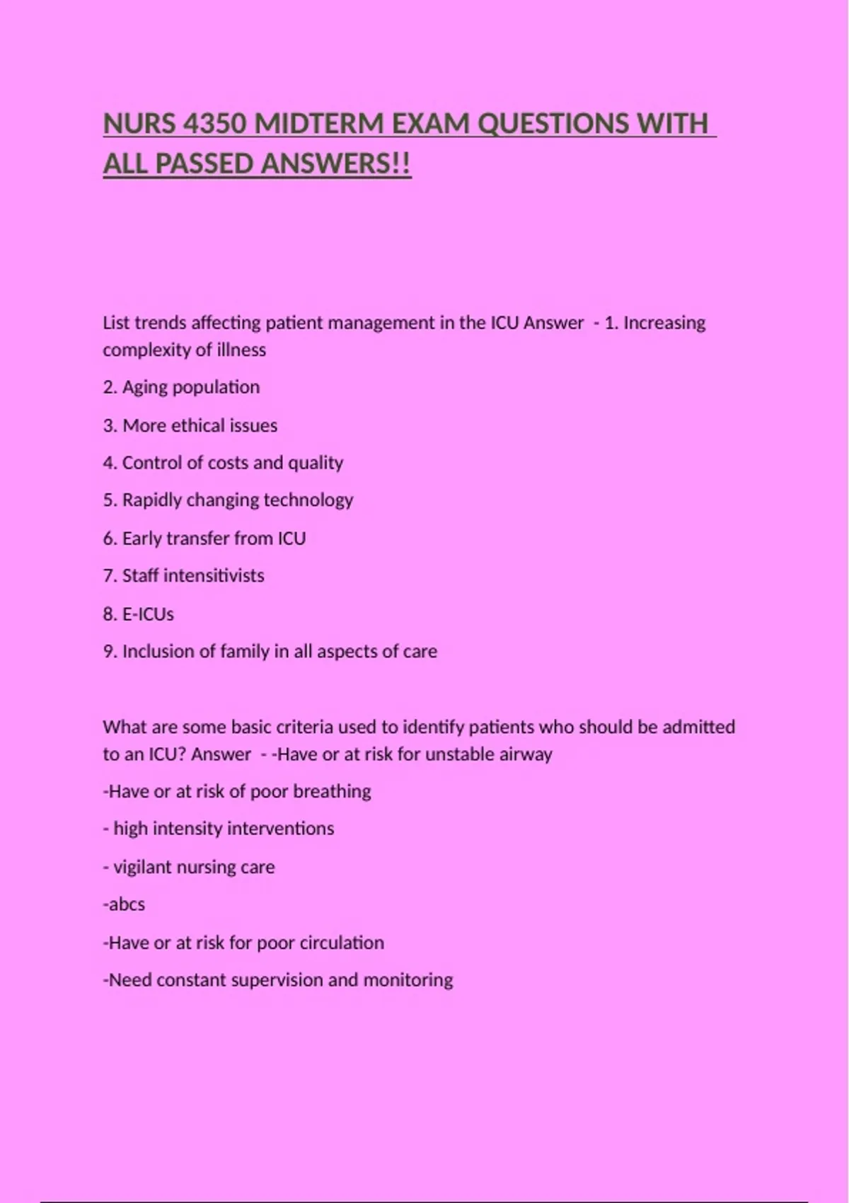 NURS 4350 MIDTERM EXAM QUESTIONS WITH ALL PASSED ANSWERS!!