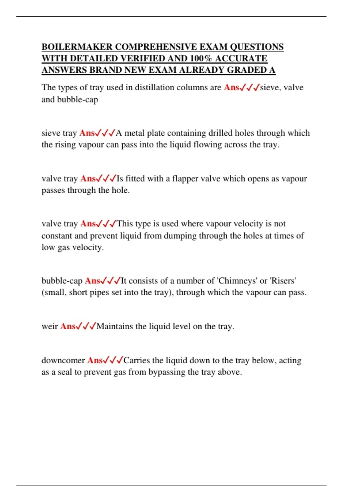 weir Ans✓✓✓Maintains the liquid level on the tray.