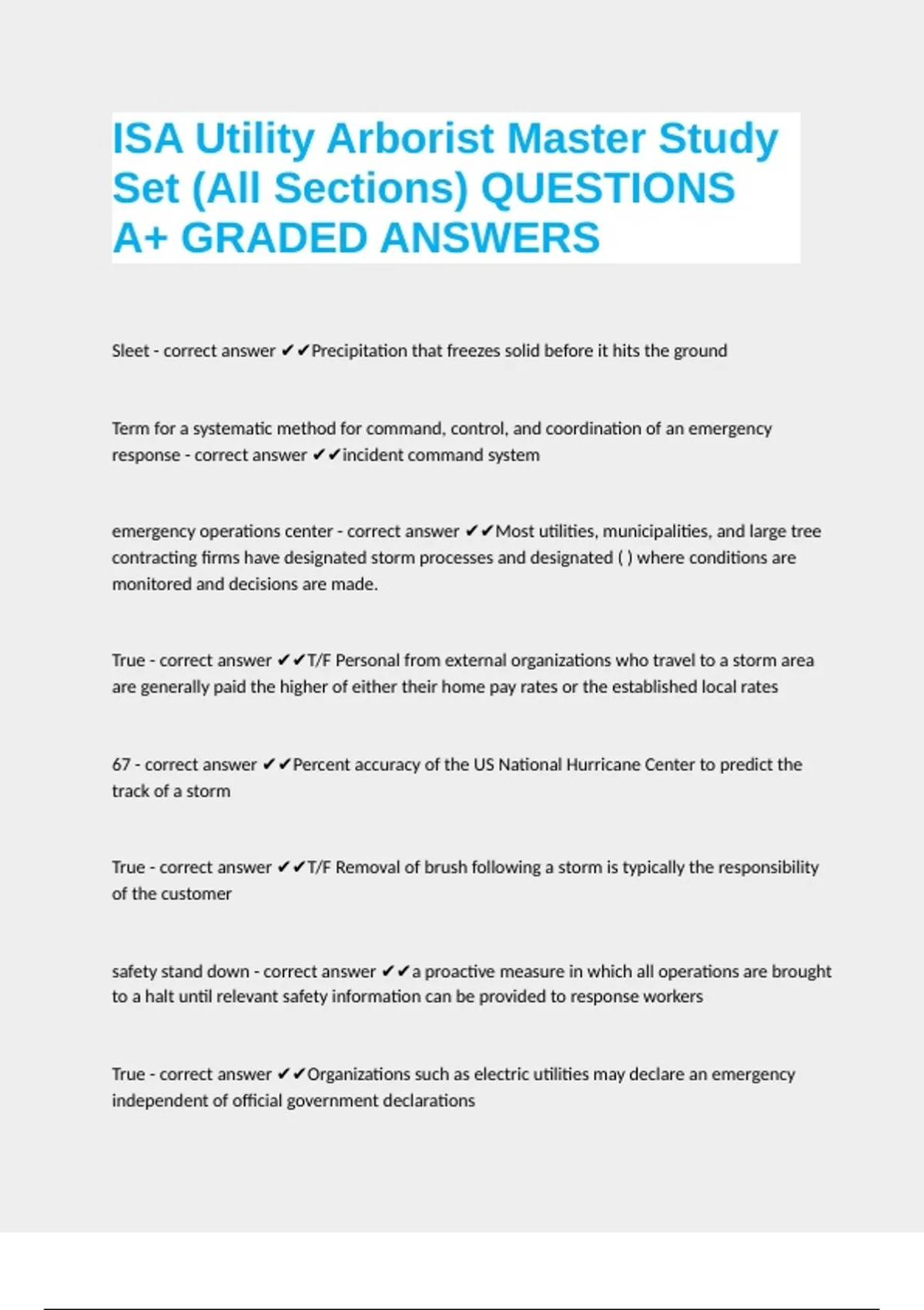 ISA Utility Arborist Master Study Set (All Sections) QUESTIONS A+ GRADED ANSWERS Sleet - correct answer Precipitation that freezes solid before it hits the ground Term for a systematic method for command, control, and coordination of an emergency response - correct answer incident command system