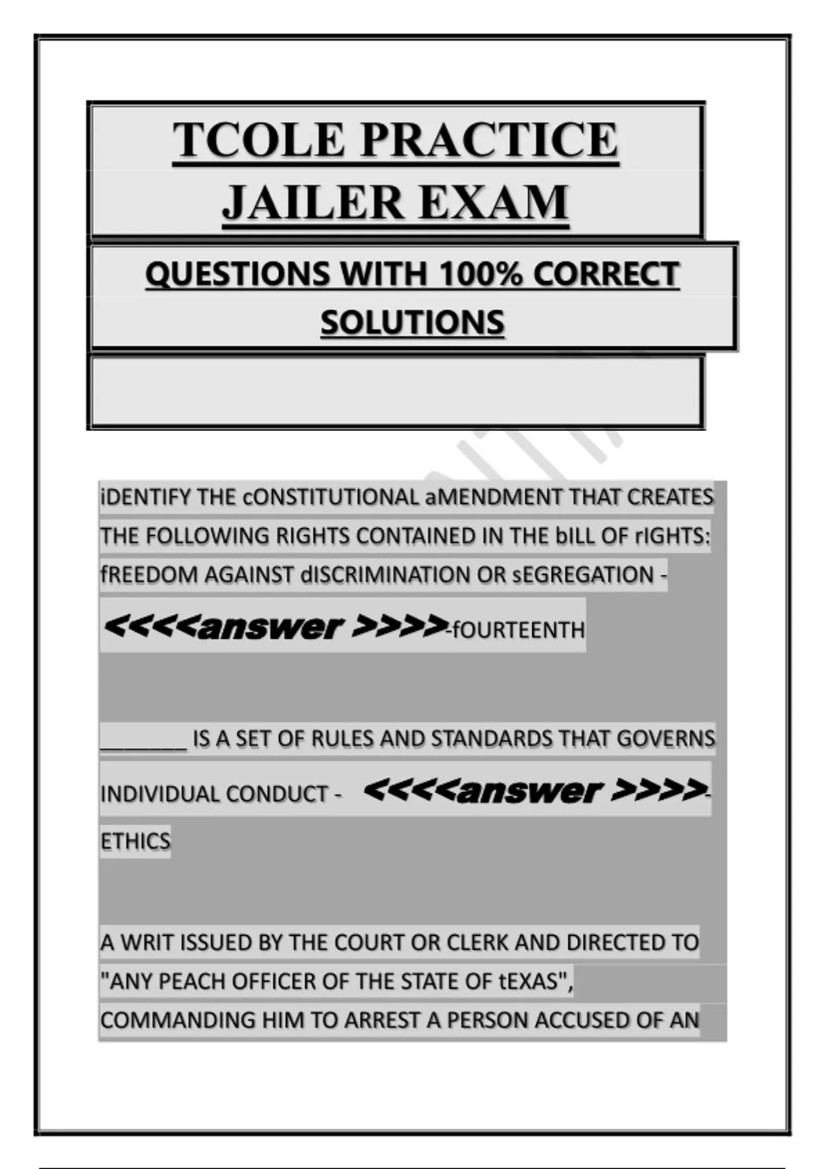 TCOLE PRACTICE JAILER EXAM QUESTIONS WITH 100% CORRECT SOLUTIONS iDENTIFY THE cONSTITUTIONAL aMENDMENT THAT CREATES THE FOLLOWING RIGHTS CONTAINED IN THE bILL OF rIGHTS: fREEDOM AGAINST dISCRIMINATION OR sEGREGATION - <<<<answer >>>>-fOURTEENTH _______ IS A SET OF RULES AND STANDARDS THAT GOVERNS INDIVIDUAL CONDUCT - <<<<answer >>>> ETHICS A WRIT ISSUED BY THE COURT OR CLERK AND DIRECTED TO "ANY PEACH OFFICER OF THE STATE OF tEXAS", COMMANDING HIM TO ARREST A PERSON ACCUSED OF AN OFFENSE AND BRING HIM BEFORE THAT COURT IMMEDIATELY, OR ON A DAY OR AT A TERM STATED IN THE WRIT IS A: - <<<<answer >>>>-cAPIAS tHIS TYPE OF HOSTAGE TAKER PLANS INCIDENTS WELL AND THEIR INTENT IS TO BE "HEARD" BY SOMEONE OTHER THAN CORRECTIONAL STAGG: - <<<<answer >>>> GRIEVANCE AIRER iMPROPER USE OF FORCE OR EXCESSIVE FORCE MAY SUBJECT CORRECTIONS OFFICER TO: - <<<<answer >>>>-CIVIL AND CRIMINAL LIABILITY WITH ptsd, THE ONSET OF SYMPTOMS RE-EXPERIENCING THE EVENT MAY BE DELAYED UP TO _____ OR LONGER - <<<<answer >>>>-6 MONTHS ccp, ARTICLE 49.18 STATES "IF A PRISONER DIES WHILE CONFINED IN A JAIL OR PRISON, THE DIRECTOR OF THE LAW
