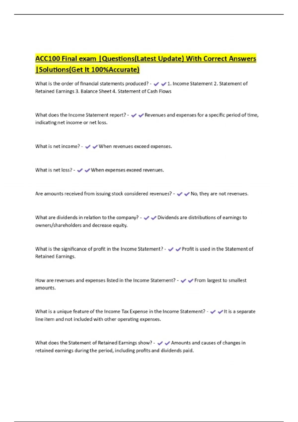 ACC100 Final exam |Questions(Latest Update) With Correct Answers |Solutions(Get It 100%Accurate)
