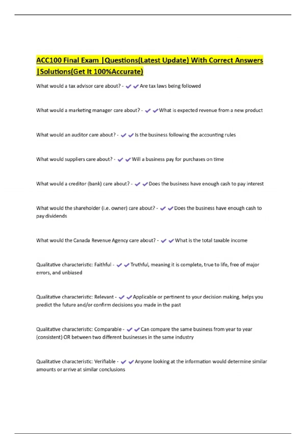 ACC100 Final Exam |Questions(Latest Update) With Correct Answers |Solutions(Get It 100%Accurate)