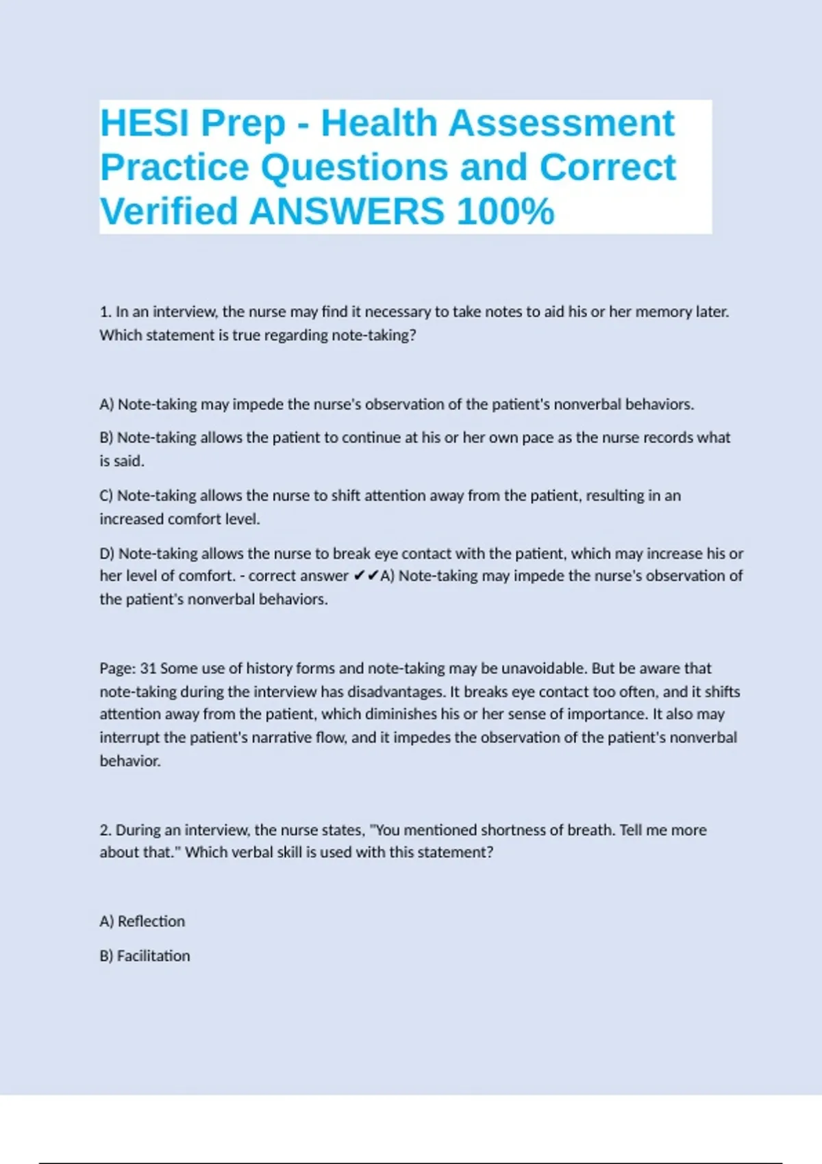 HESI Prep - Health Assessment Practice Questions and Correct Verified ANSWERS 100% 1. In an interview, the nurse may find it necessary to take notes to aid his or her memory later. Which statement is true regarding note-taking? A) Note-taking may impede the nurse's observation of the patient's nonverbal behaviors. B) Note-taking allows the patient to continue at his or her own pace as the nurse records what is said. C) Note-taking allows the nurse to shift attention away from the patient, resulting in an increased comfort level. D) Note-taking allows the nurse to break eye contact with the patient, which may increase his or her level of comfort. - correct answer A) Note-taking may impede the nurse's observation of the patient's nonverbal behaviors.