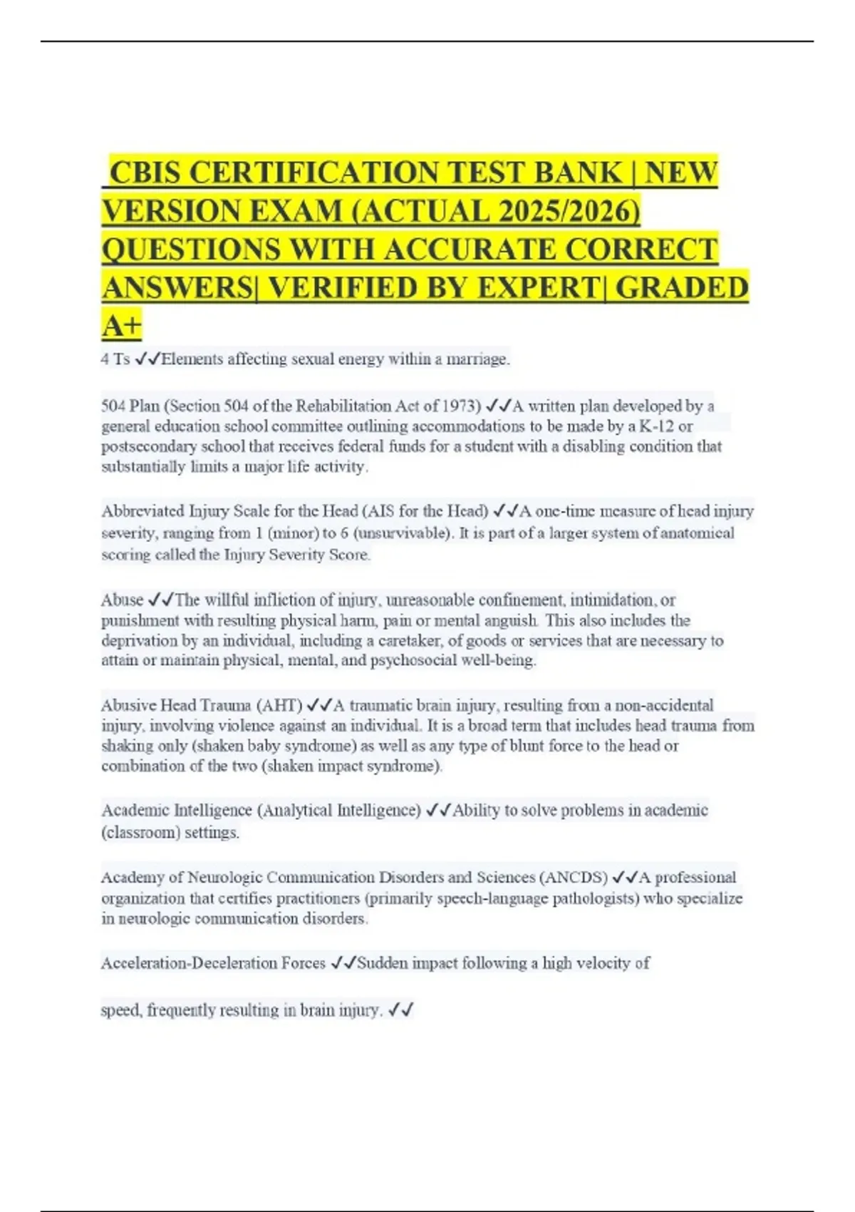 CBIS CERTIFICATION TEST BANK | NEW VERSION EXAM (ACTUAL 2025/2026) QUESTIONS WITH ACCURATE CORRECT ANSWERS| VERIFIED BY EXPERT| GRADED A 4 Ts Elements affecting sexual energy within a marriage. 504 Plan (Section 504 of the Rehabilitation Act of 1973) A written plan developed by a general education school committee outlining accommodations to be made by a K-12 or postsecondary school that receives federal funds for a student with a disabling condition that substantially limits a major life activity. Abbreviated Injury Scale for the Head (AIS for the Head) A one-time measure of head injury severity, ranging from 1 (minor) to 6 (unsurvivable). It is part of a larger system of anatomical scoring called the Injury Severity Score. Abuse The willful infliction of injury, unreasonable confinement, intimidation, or punishment with resulting physical harm, pain or mental anguish. This also includes the deprivation by an individual, including a caretaker, of goods or services that are necessary to attain or maintain physical, mental, and psychosocial well-being. Abusive Head Trauma (AHT) A traumatic brain injury, resulting from a non-accidental injury, involving violence against an individual. It is a broad term that includes head trauma from shaking only (shaken baby syndrome) as well as any type of blunt force to the head or combination of the two (shaken impact syndrome).