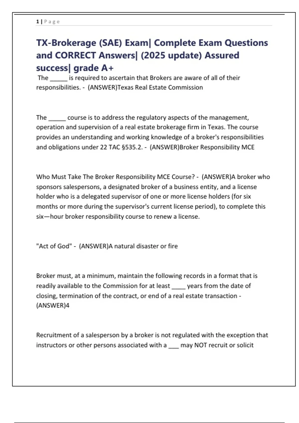 TX-Brokerage (SAE) Exam| Complete Exam Questions and CORRECT Answers| (2025 update) Assured success| grade A+