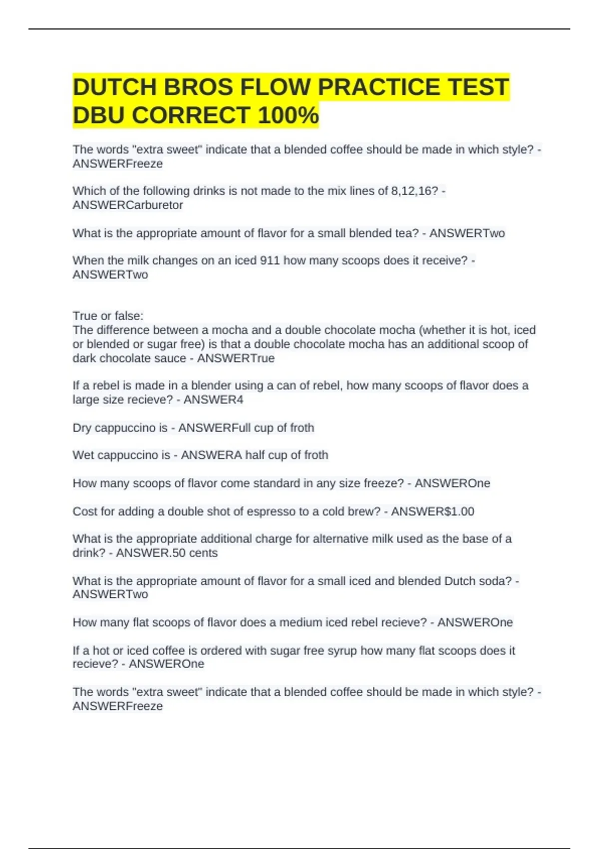 DUTCH BROS FLOW PRACTICE TEST DBU CORRECT 100%