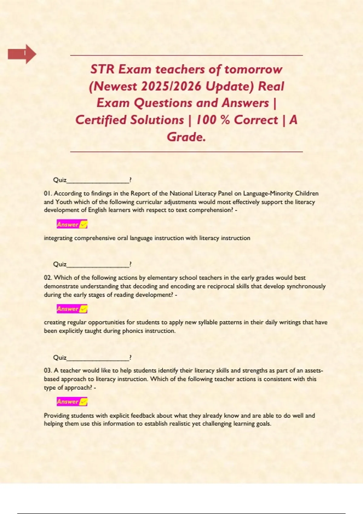 STR Exam teachers of tomorrow (Newest 2025/2026 Update) Real Exam Questions and Answers | Certified Solutions | 100 % Correct | A Grade. Quiz_________________? 01. According to findings in the Report of the National Literacy Panel on Language-Minority Children and Youth which of the following curricular adjustments would most effectively support the literacy development of English learners with respect to text comprehension? - Answer☑️ integrating comprehensive oral language instruction with literacy instruction Quiz_________________? 02. Which of the following actions by elementary school teachers in the early grades would best demonstrate understanding that decoding and encoding are reciprocal skills that develop synchronously during the early stages of reading development? - Answer☑️ creating regular opportunities for students to apply new syllable patterns in their daily writings that have been explicitly taught during phonics instruction. Quiz_________________? 03. A teacher would like to help students identify their literacy skills and strengths as part of an assets-based approach to literacy instruction. Which of the following teacher actions is consistent with this type of approach? - Answer☑️ Providing students with explicit feedback about what they already know and are able to do well and helping them use this information to establish realistic yet challenging learning goals. Quiz_________________? 04. A school district in Texas has adopted the Multi-Tiered Systems of Support (MTSS) model of instruction in their K-3 literacy program which includes a core reading program (Tier 1) supplemental instruction (Tier 2) and intensive instruction (Tier 3) Instructional grouping in Tier 2 is restricted to five or fewer students. This limitation enhances the effectiveness of literacy instruction for the students primarily by: - Answer☑️ Providing students with increased opportunities to practice developing skills with teacher feedback. Quiz_________________? 05. A second-grade student has been identified with dysgraphia but does not have difficulty with decoding or encoding. Which of the following approaches to instruction would be most effective in promoting the student's development with respect to the identified area of need? - Answer☑️ Providing the student with explicit instruction in letter formation and frequent, short, guided-practice sessions to build the student's handwriting fluency and automaticity in letter memory and formation. Quiz_________________? 06. In which line in the table below is the underlined portion of the example word accurately matched to the phonics term that is used to describe that phonics element? Line Phonics Term Example word 1 blend they 2 digraph factor 3 diphthong power 4 trigraph scrap - Answer☑️ Line 3