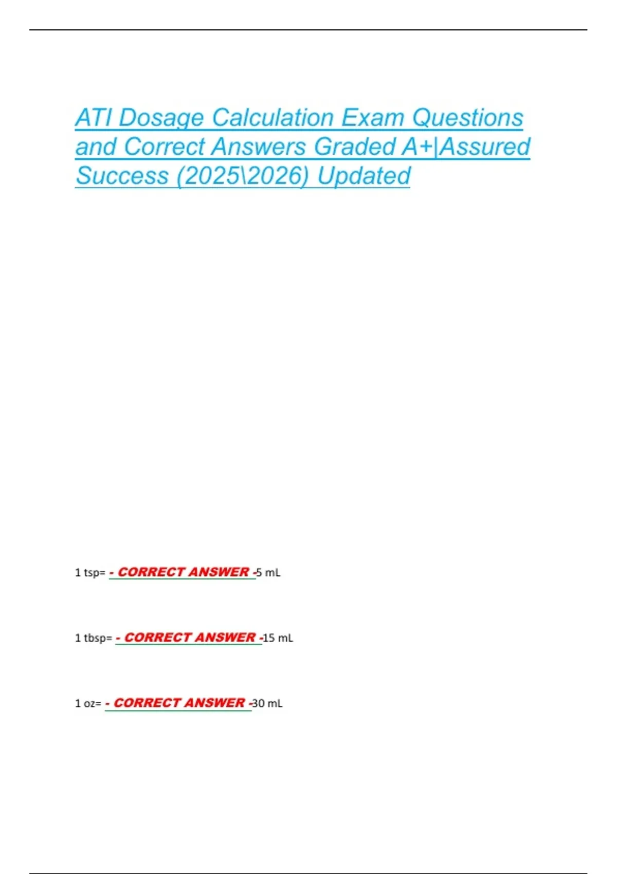 ATI Dosage Calculation Exam Questions and Correct Answers Graded A+|Assured Success () Updated