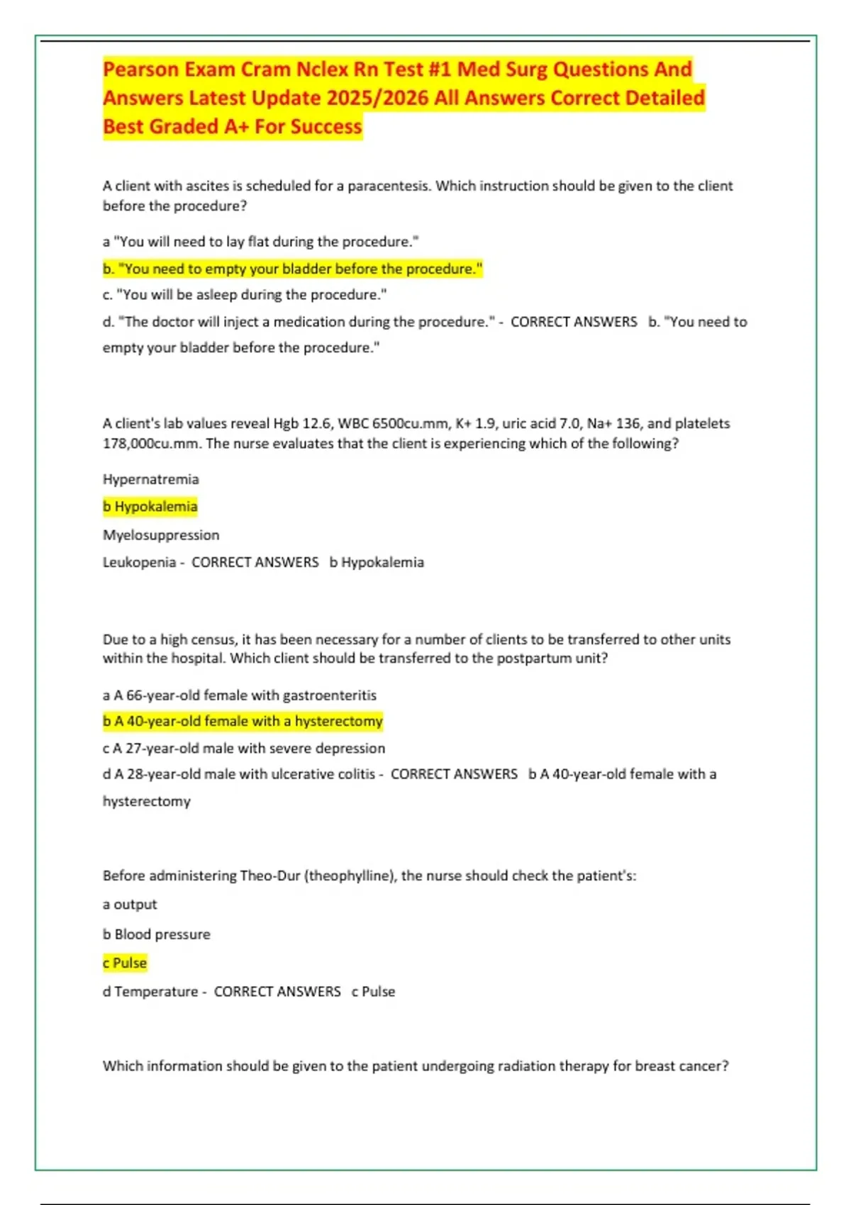 , Pearson Exam Cram Nclex Rn Test #1 Med Surg Questions And