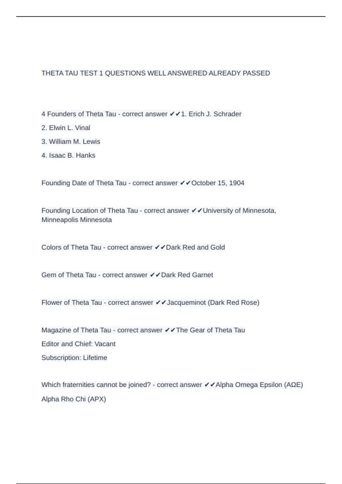 Founding Location of Theta Tau - correct answer ✔✔University of Minnesota,