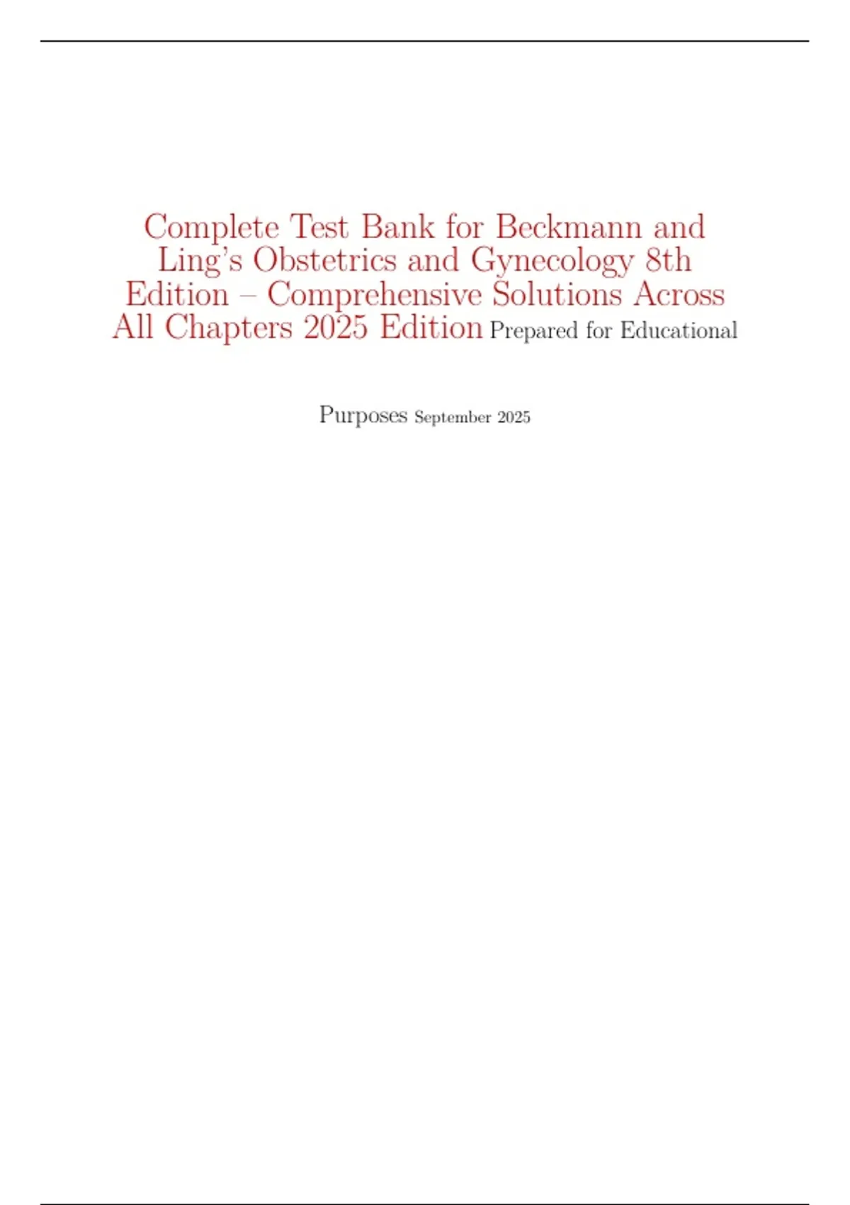 Complete Test Bank for Beckmann and Ling’s Obstetrics and Gynecology 8th Edition– Comprehensive Solutions Across All Chapters 2025 EditionPrepared for Educational Purposes September 2025 Contents 1 UnitI:GeneralObstetricsandGynecology . . . . . . . . . . . . . . . . . . . . 2 1.1 Chapter1:Women’sHealthExaminationandWomen’sHealthCareMan agement . . . . . . . . . . . . . . . . . . . . . . . . . . . . . . . . . . . . 2 1.2 Chapter2: TheObstetrician–Gynecologist’sRole inScreeningandPreventiveCare . . . . . . . . . . . . . . . . . . . . . . . . . . . . . . . . . . 4 2 UnitII:Obstetrics . . . . . . . . . . . . . . . . . . . . . . . . . . . . . . . . . 4 2.1 Chapter5:Maternal–FetalPhysiology . . . . . . . . . . . . . . . . . . . 4 2.2 Chapter6:PreconceptionandAntepartumCare. . . . . . . . . . . . . . 5 2.3 Chapter7:PubertyandMenopause. . . . . . . . . . . . . . . . . . . . . 6 2.4 Chapter8: SexuallyTransmittedInfections . . . . . . . . . . . . . . . . 9 2.5 Chapter9:MenstrualDisorders . . . . . . . . . . . . . . . . . . . . . . . 10 3 UnitIII:Gynecology . . . . . . . . . . . . . . . . . . . . . . . . . . . . . . . . 10 3.1 Chapter10:Contraception. . . . . . . . . . . . . . . . . . . . . . . . . . 10 3.2 Chapter11:EndometriosisandAdenomyosis. . . . . . . . . . . . . . . . 11 4 UnitIV:ReproductiveEndocrinology. . . . . . . . . . . . . . . . . . . . . . . 11 4.1 Chapter12:PolycysticOvarySyndrome(PCOS) . . . . . . . . . . . . . 11 4.2 Chapter13: Infertility . . . . . . . . . . . . . . . . . . . . . . . . . . . . 12 5 UnitV:AdditionalQuestions . . . . . . . . . . . . . . . . . . . . . . . . . . . 12 5.1 Chapter14:ComprehensiveReviewQuestions . . . . . . . . . . . . . . . 12