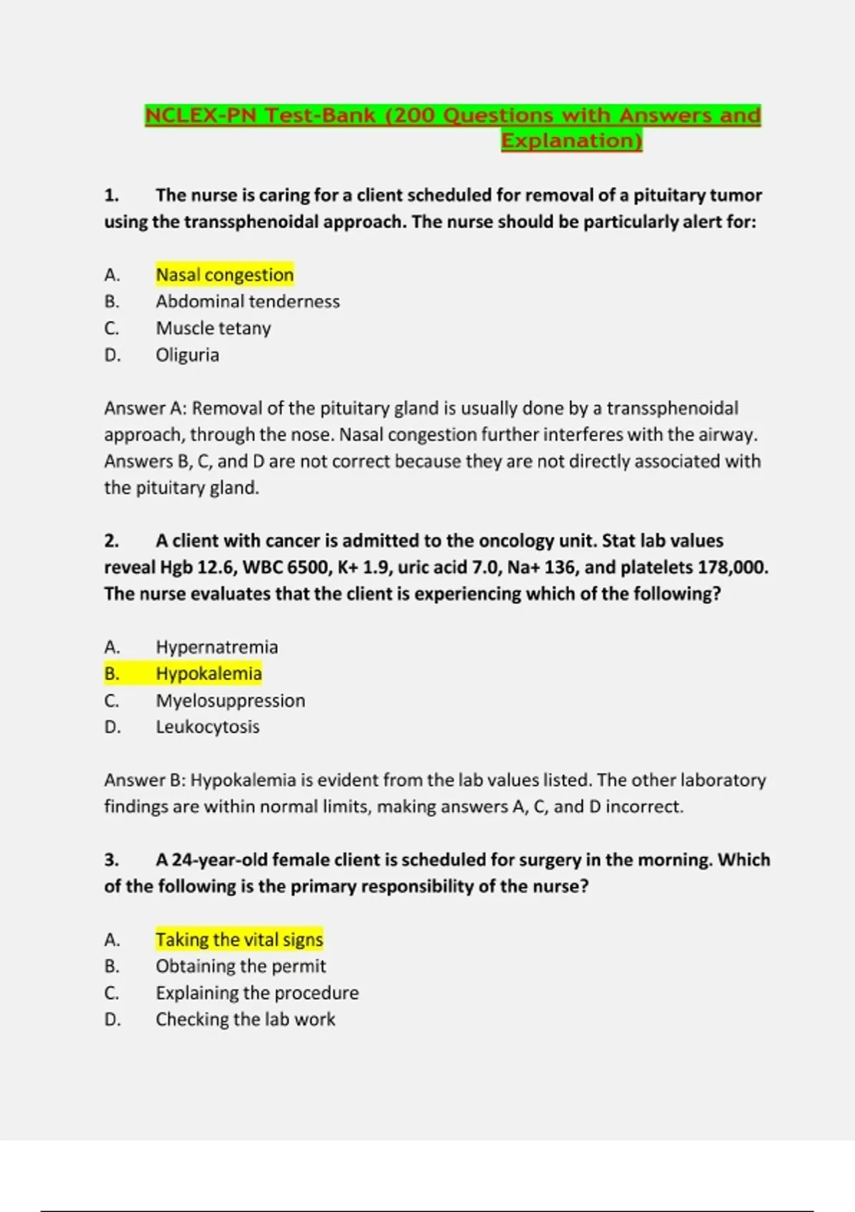 NCLEX PN TEST BANK (200 QUESTIONS WITH ANSWERS AND EXPLANATION