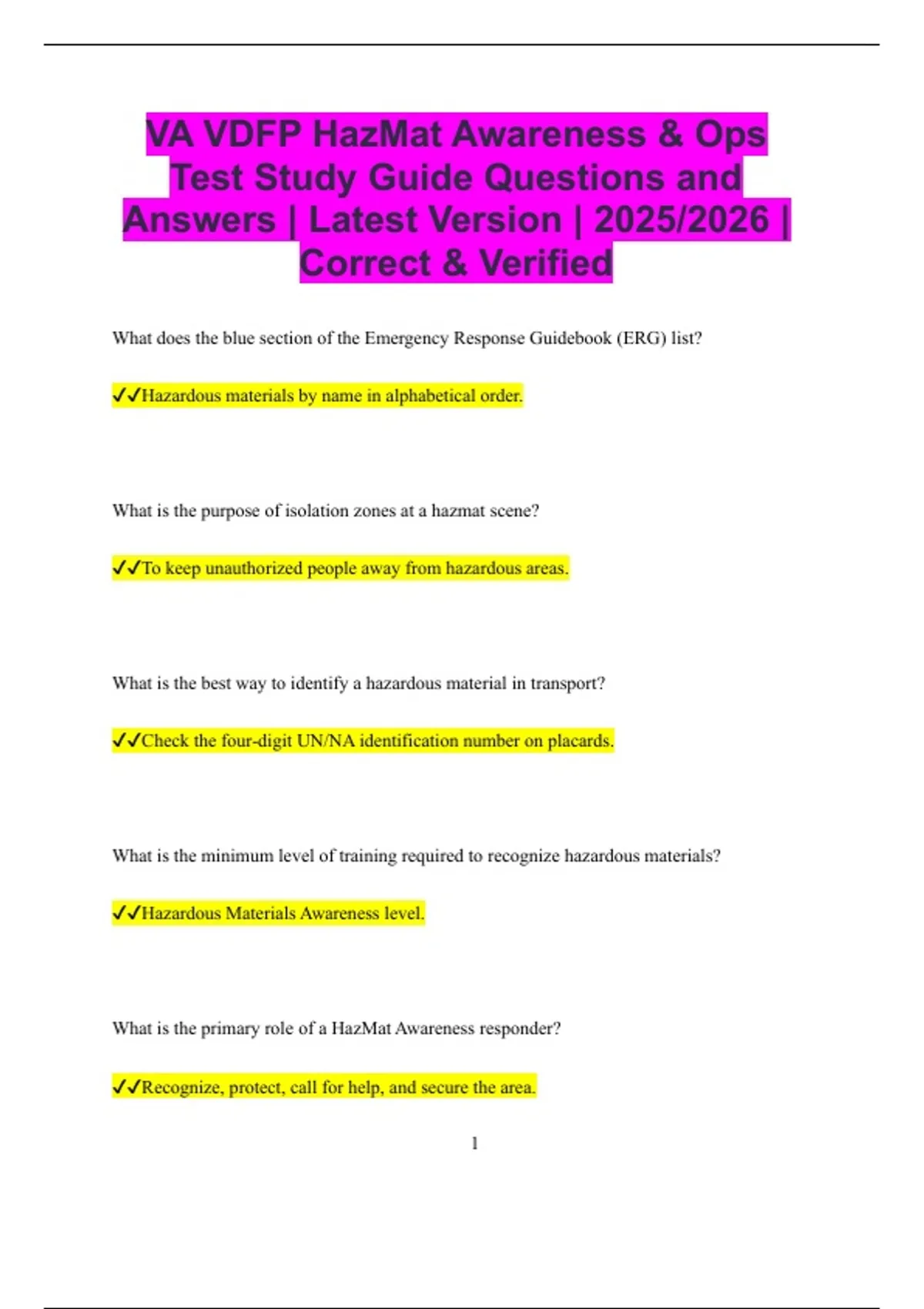 VA VDFP HazMat Awareness & Ops Test Study Guide Questions and Answers | Latest Version | 2025/2026 | Correct & Verified What does the blue section of the Emergency Response Guidebook (ERG) list? Hazardous materials by name in alphabetical order. What is the purpose of isolation zones at a hazmat scene? To keep unauthorized people away from hazardous areas. What is the best way to identify a hazardous material in transport? Check the four-digit UN/NA identification number on placards. What is the minimum level of training required to recognize hazardous materials? Hazardous Materials Awareness level. What is the primary role of a HazMat Awareness responder? Recognize, protect, call for help, and secure the area. 2 What color ERG section provides initial isolation and protective distances? The green section. What is the definition of an IDLH atmosphere? Immediately Dangerous to Life and Health. What is the priority when approaching a hazmat incident? Approach from uphill, upwind, and upstream. What does the red diamond on an NFPA 704 placard indicate? Flammability hazard. What does the yellow diamond on an NFPA 704 placard represent? Reactivity or instability hazard. What does the white diamond on an NFPA 704 placard show? Special hazard information. 3 What does the number 4 in any NFPA diamond quadrant mean? It indicates the highest level of hazard. What are the three zones at a hazmat scene? Hot zone, warm zone, and cold zone. What is the purpose of the cold zone? To serve as the command post and safe staging area. What should an Awareness level responder never attempt? Offensive actions like plugging or patching a leak. What type of hazard does a Class 3 placard represent? Flammable liquids. What type of hazard does a Class 2 placard represent? Gases. 4 What type of hazard does a Class 6 placard represent? Toxic or infectious substances. What type of hazard does a Class 7 placard represent?