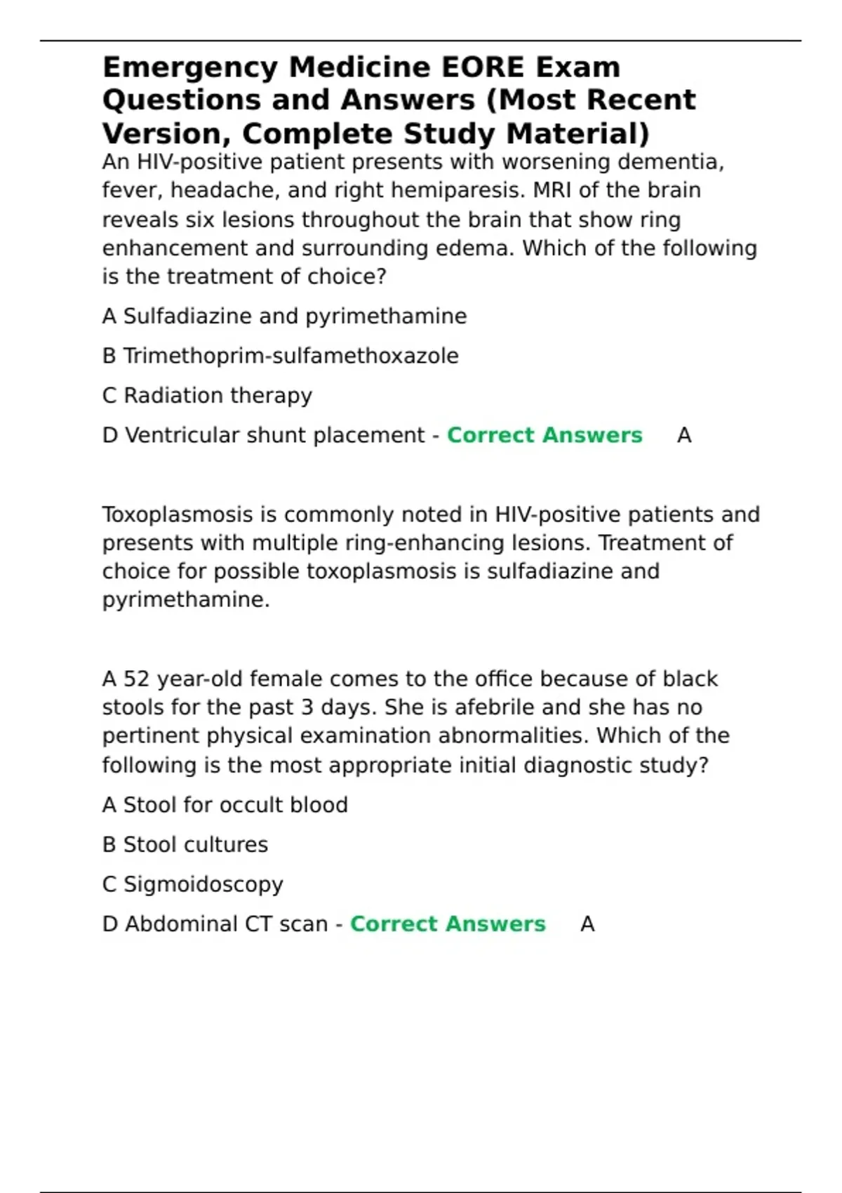 Emergency Medicine EORE Exam Questions and Answers (Most Recent Version, Complete Study
