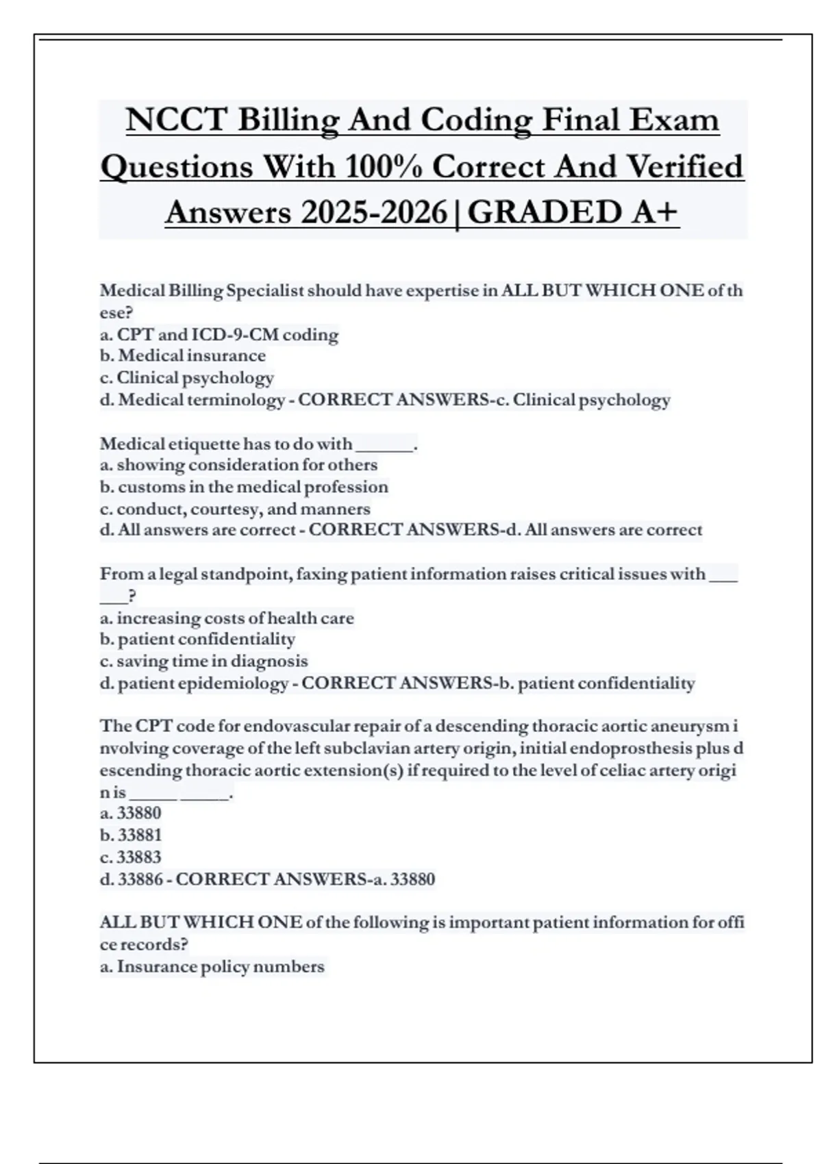 NCCT Billing And Coding Final Exam Questions With 100% Correct And Verified Answers |GRADED A+