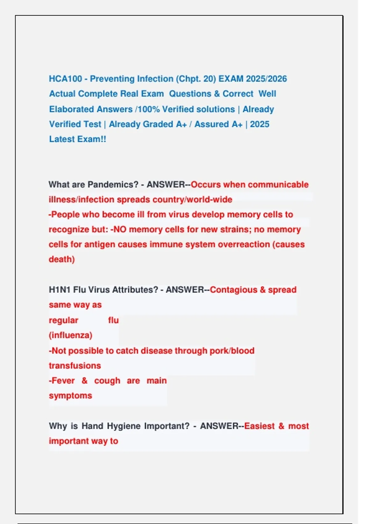 HCA100 - Preventing Infection (Chpt. 20) EXAM 2025/2026 Actual Complete Real Exam Questions & Correct Well Elaborated Answers /100% Verified solutions | Already Verified Test | Already Graded A+ / Assured A+ | 2025 Late