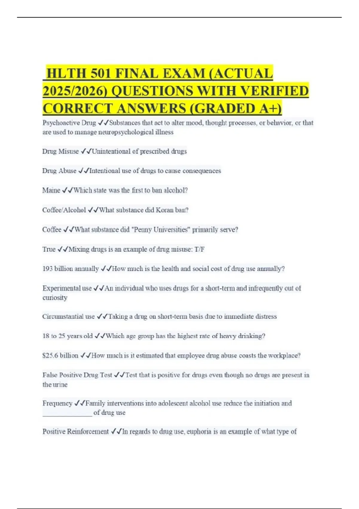 HLTH 501 FINAL EXAM (ACTUAL 2025/2026) QUESTIONS WITH VERIFIED CORRECT ANSWERS (GRADED A+) Psychoactive Drug Substances that act to alter mood, thought processes, or behavior, or that are used to manage neuropsychological illness Drug Misuse Unintentional of prescribed drugs Drug Abuse Intentional use of drugs to cause consequences Maine Which state was the first to ban alcohol? Coffee/Alcohol What substance did Koran ban? Coffee What substance did "Penny Universities" primarily serve? True Mixing drugs is an example of drug misuse: T/F 193 billion annually How much is the health and social cost of drug use annually? Experimental use An individual who uses drugs for a short-term and infrequently out of curiosity Circumstantial use Taking a drug on short-term basis due to immediate distress 18 to 25 years old Which age group has the highest rate of heavy drinking?