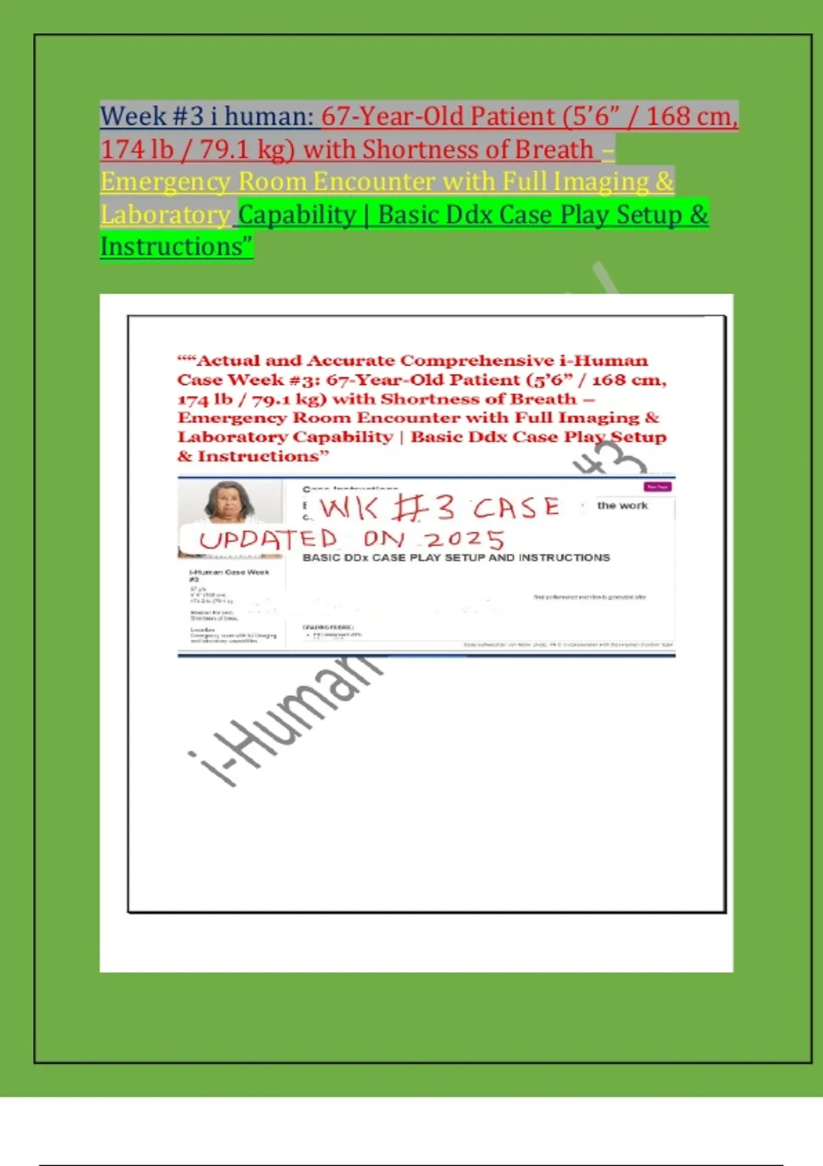 Week #3 i human: 67-Year-Old Patient (5’6” / 168 cm, 174 lb / 79.1 kg) with Shortness of Breath – Emergency Room Encounter with Full Imaging & Laboratory Capability | Basic Ddx Case Play Setup & Instructions”