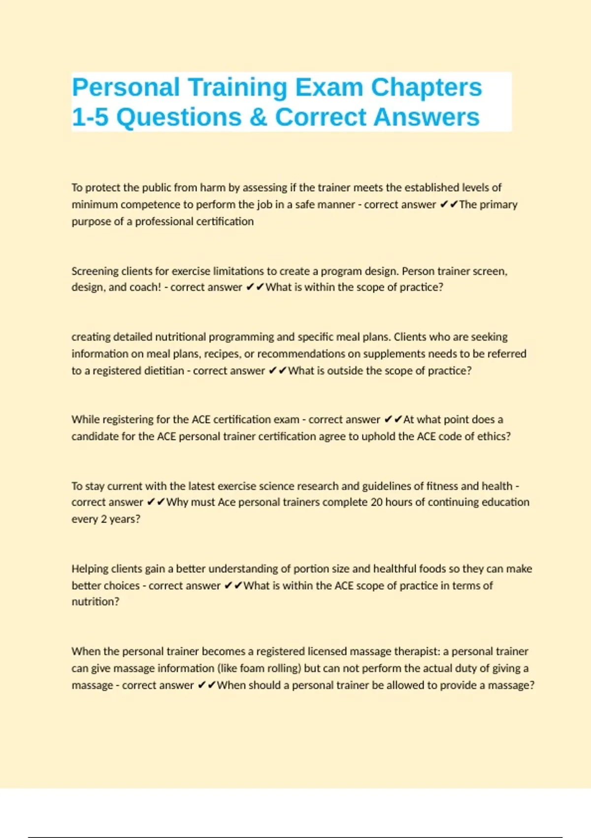 Personal Training Exam Chapters 1-5 Questions & Correct Answers To protect the public from harm by assessing if the trainer meets the established levels of minimum competence to perform the job in a safe manner - correct answer The primary purpose of a professional certification