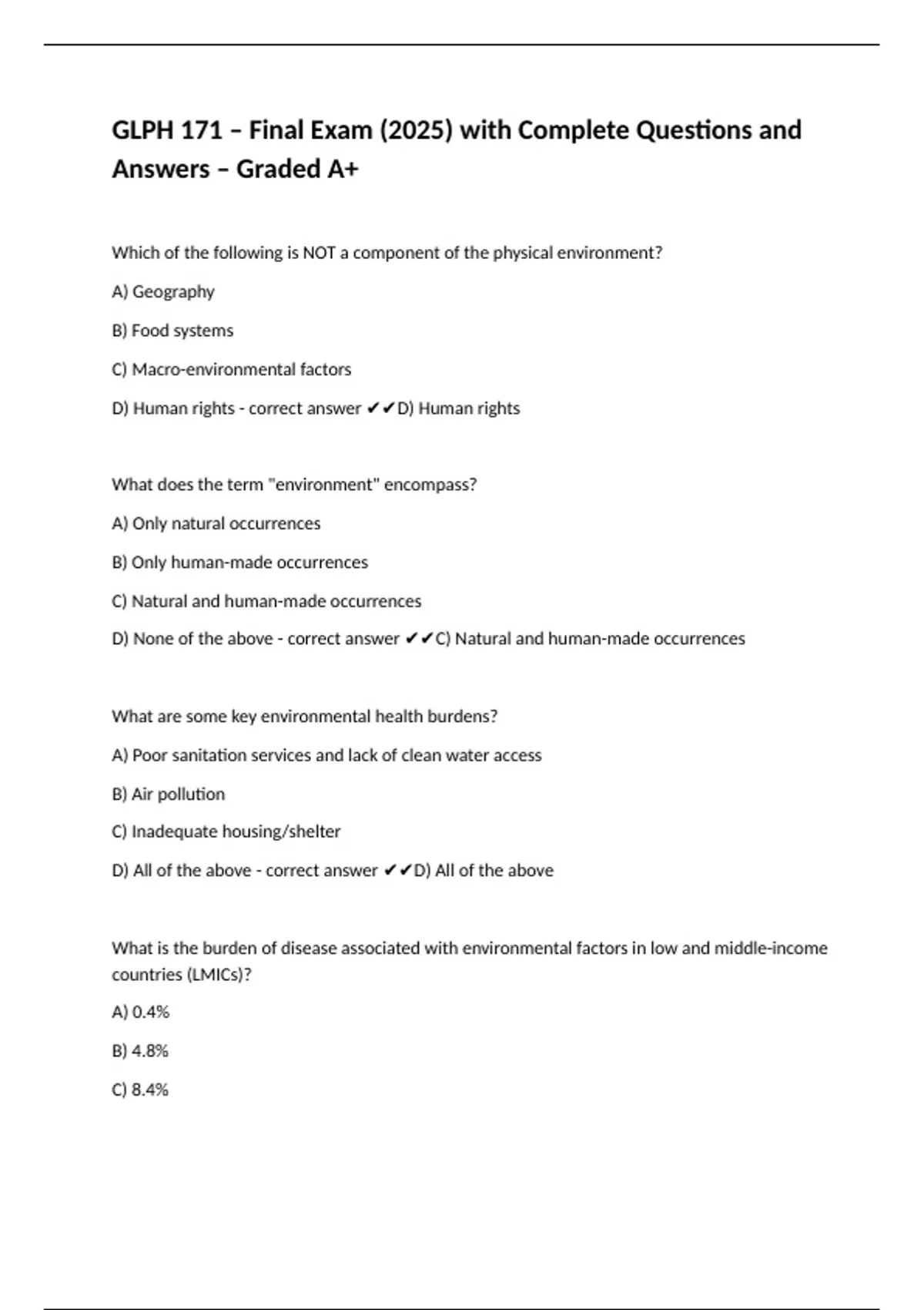 GLPH 171 – Final Exam (2025) with Complete Questions and Answers – Graded A+This document provides the full set of GLPH 171 final exam questions for 2025 with detailed, well-structured answers. Each solution is explained thoroughly, reflecting the quality of an A+ graded submission. It is designed as a reliable study resource to review all modules, practice exam-style questions, and prepare effectively for the 2025 final assessment.