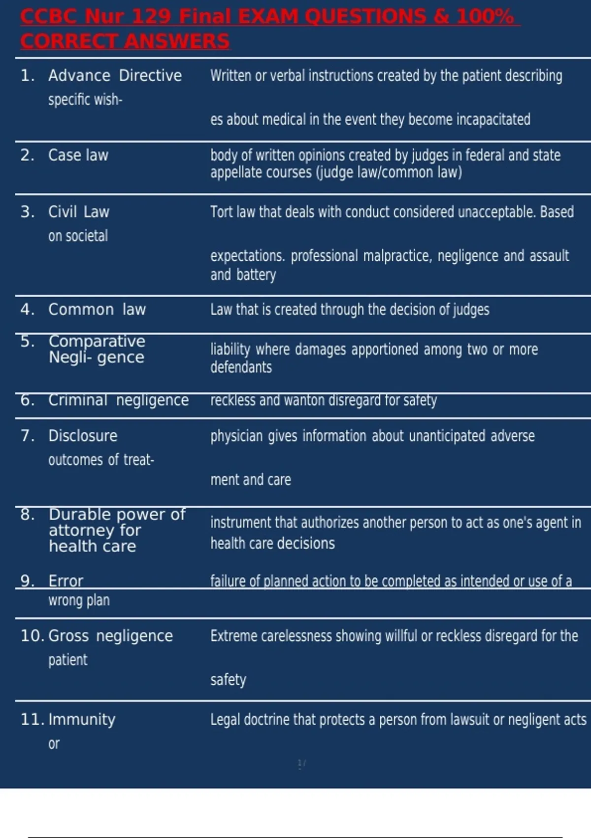 CCBC Nur 129 Final EXAM QUESTIONS & 100% CORRECT ANSWERS 1. Case law body of written opinions created by judges in federal and state appellate courses (judge law/common law) 2. Civil Law Tort law that deals with conduct considered unacceptable. Based on societal expectations. professional malpractice, negligence and assault and battery 3. Common law Law that is created through the decision of judges
