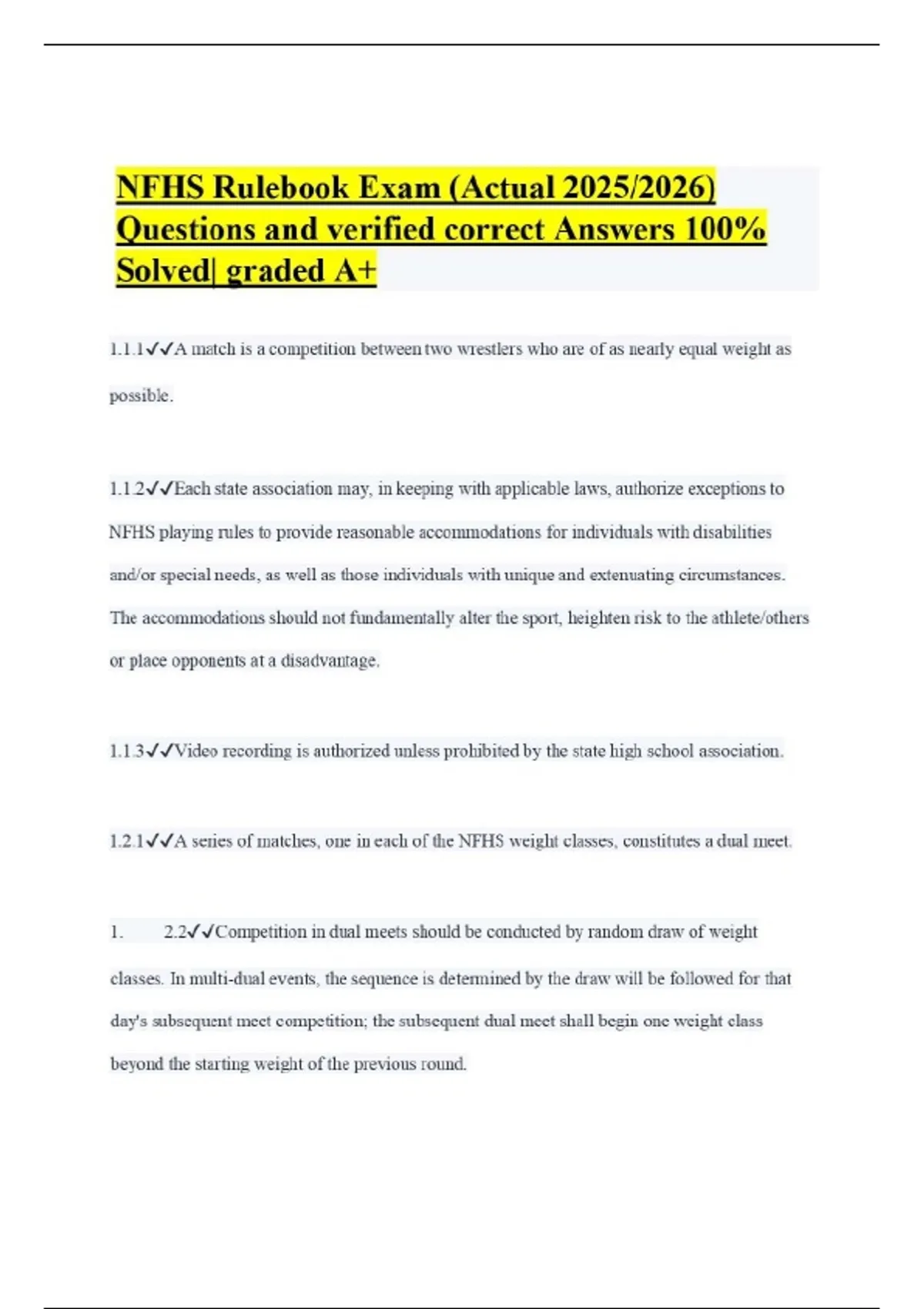 NFHS Rulebook Exam (Actual 2025/2026) Questions and verified correct Answers 100% Solved| graded A+ 1.1.1A match is a competition between two wrestlers who are of as nearly equal weight as possible. 1.1.2Each state association may, in keeping with applicable laws, authorize exceptions to NFHS playing rules to provide reasonable accommodations for individuals with disabilities and/or special needs, as well as those individuals with unique and extenuating circumstances. The accommodations should not fundamentally alter the sport, heighten risk to the athlete/others or place opponents at a disadvantage. 1.1.3Video recording is authorized unless prohibited by the state high school association. 1.2.1A series of matches, one in each of the NFHS weight classes, constitutes a dual meet. 1. 2.2Competition in dual meets should be conducted by random draw of weight classes. In multi-dual events, the sequence is determined by the draw will be followed for that day's subsequent meet competition; the subsequent dual meet shall begin one weight class beyond the starting weight of the previous round.