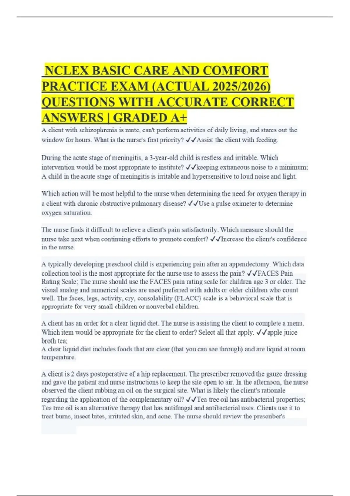 NCLEX BASIC CARE AND COMFORT PRACTICE EXAM (ACTUAL 2025/2026) QUESTIONS WITH ACCURATE CORRECT ANSWERS | GRADED A+ A client with schizophrenia is mute, can't perform activities of daily living, and stares out the window for hours. What is the nurse's first priority? Assist the client with feeding. During the acute stage of meningitis, a 3-year-old child is restless and irritable. Which intervention would be most appropriate to institute? keeping extraneous noise to a minimum; A child in the acute stage of meningitis is irritable and hypersensitive to loud noise and light. Which action will be most helpful to the nurse when determining the need for oxygen therapy in a client with chronic obstructive pulmonary disease? Use a pulse oximeter to determine oxygen saturation. The nurse finds it difficult to relieve a client's pain satisfactorily. Which measure should the nurse take next when continuing efforts to promote comfort? Increase the client's confidence in the nurse. A typically developing preschool child is experiencing pain after an appendectomy. Which data collection tool is the most appropriate for the nurse use to assess the pain? FACES Pain Rating Scale; The nurse should use the FACES pain rating scale for children age 3 or older. The visual analog and numerical scales are used preferred with adults or older children who count well. The faces, legs, activity, cry, consolability (FLACC) scale is a behavioral scale that is appropriate for very small children or nonverbal children.