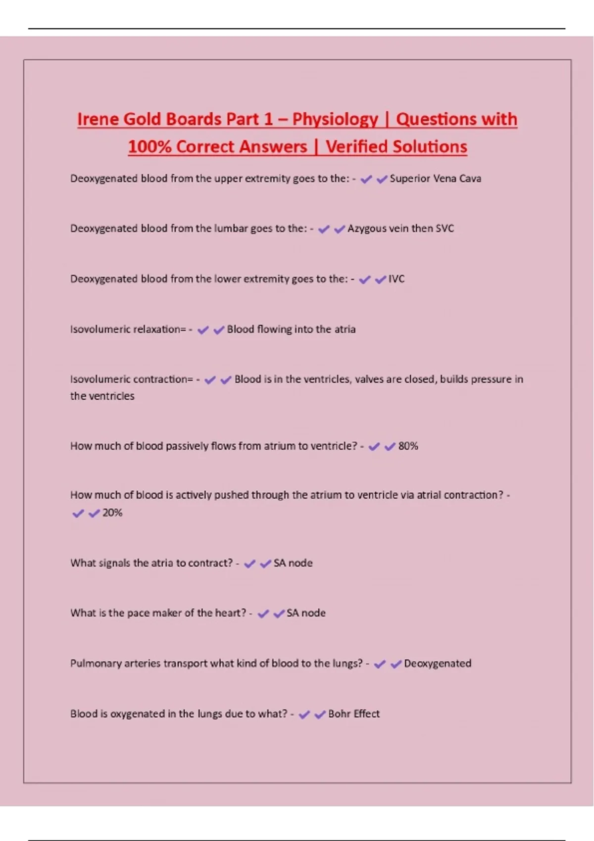 Irene Gold Boards Part 1 – Physiology | Questions with 100% Correct Answers | Verified Solutions