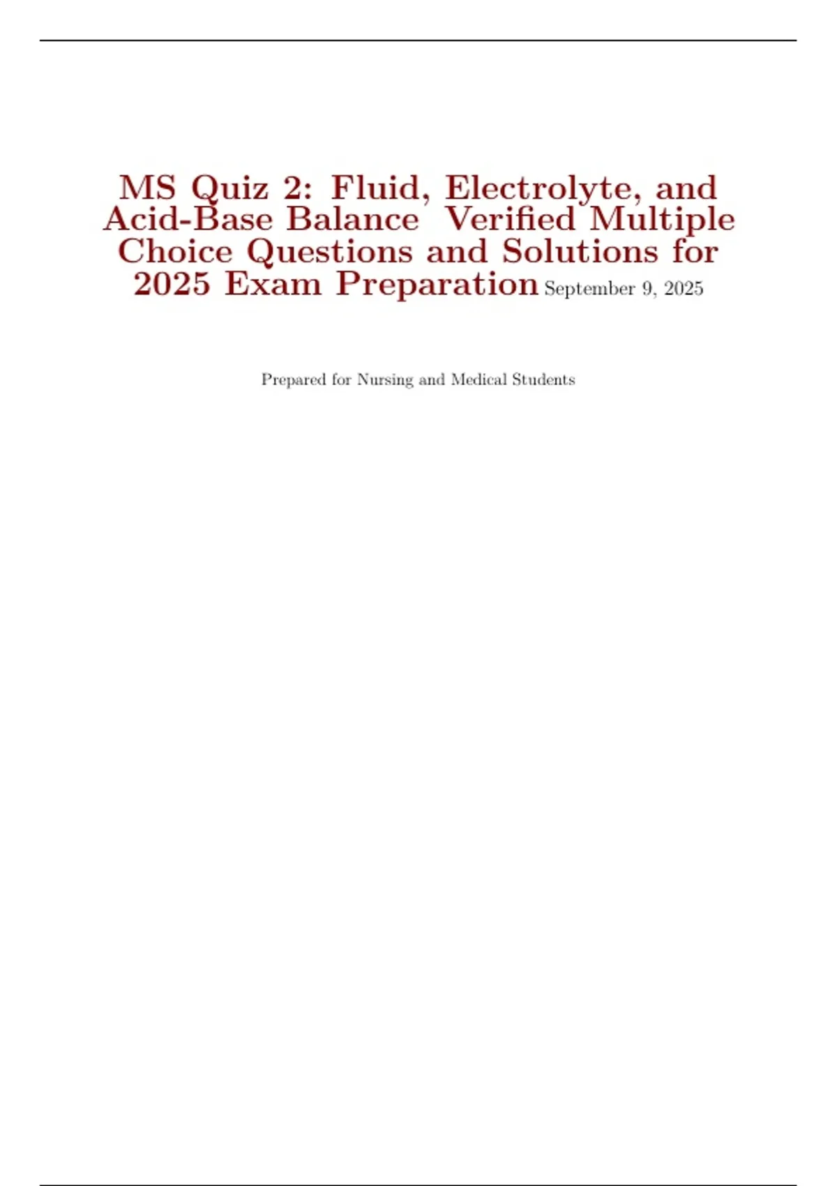 MS Quiz 2: Fluid, Electrolyte, and Acid-Base Balance Verified Multiple Choice Questions and Solutions for 2025 Exam Preparation September 9, 2025 Prepared for Nursing and Medical Students Introduction This document provides a comprehensive set of verified multiple-choice questions and solutions focused on fluid, electrolyte, and acid-base balance, tailored for 2025 exam preparation. The questions are designed to emphasize key concepts with clear, straightforward language, avoiding unnecessary jargon. Each question includes multiple-choice options, the correct answer, and a brief explanation where relevant. This edition contains 105 questions, refactored for clarity and relevance, drawing from reliable study sources to ensure accuracy and usefulness. The content is formatted for easy reading and study, with space for note-taking.