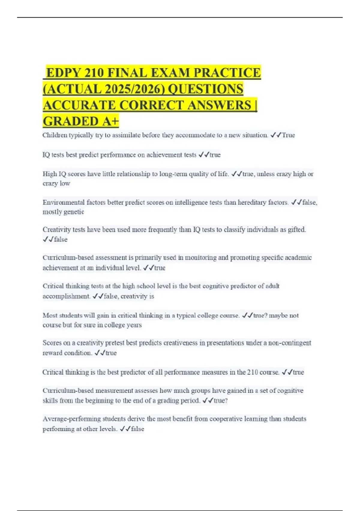 EDPY 210 FINAL EXAM PRACTICE (ACTUAL 2025/2026) QUESTIONS ACCURATE CORRECT ANSWERS | GRADED A+