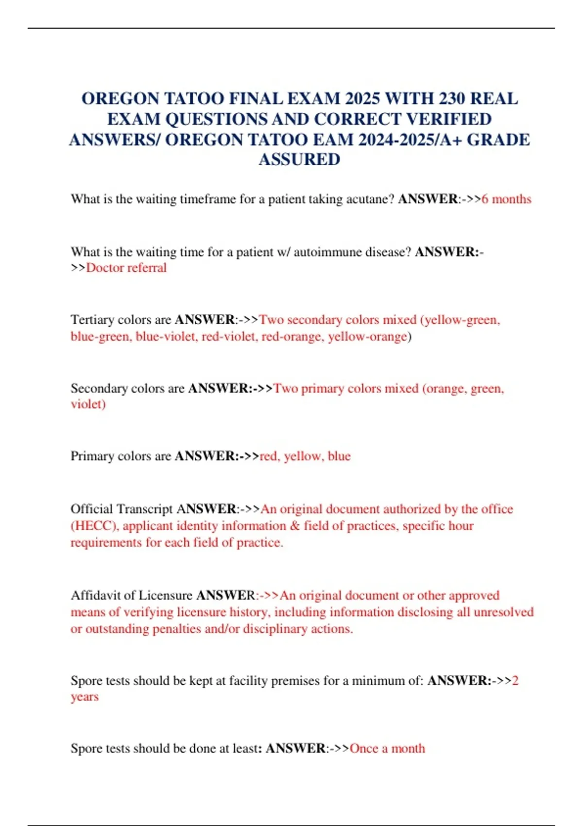 This Oregon Tattoo Final Exam Pack includes 230 real exam questions with correct, verified answers to help students and professionals prepare confidently for licensing. Updated for 2024–2025, this resource is already graded A+ and provides a reliable way to study the most up-to-date content required for the Oregon Tattoo Exam. Features: 230 real exam-style questions Correct, verified answers for accuracy Covers all essential Oregon tattooing exam topics Latest 2024–2025 update included A+ grade assurance for exam readiness This exam prep pack is the perfect study tool for anyone preparing to pass the Oregon Tattoo Final Exam in 2025.