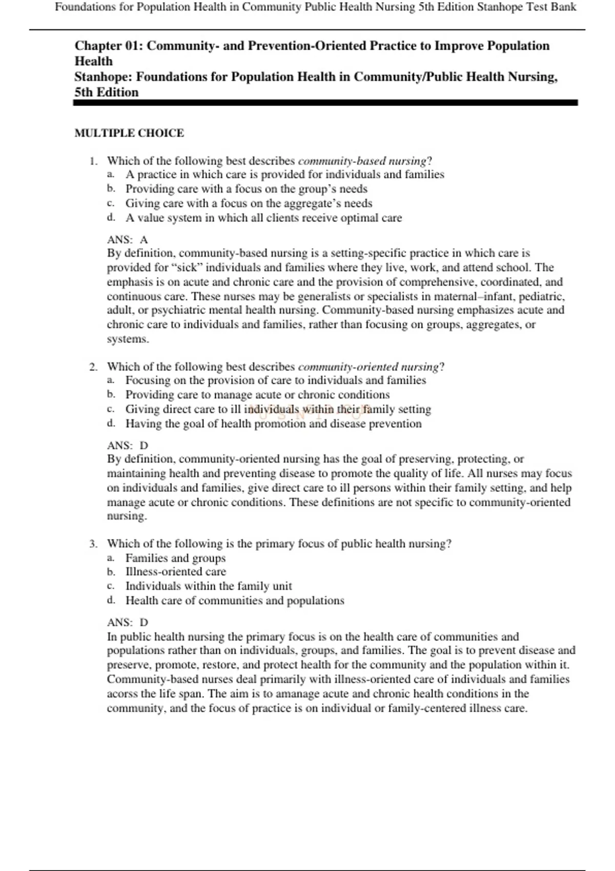 Download the Test Bank for Foundations for Population Health in Community and Public Health Nursing. Includes all chapters, verified exam questions, and accurate answers.