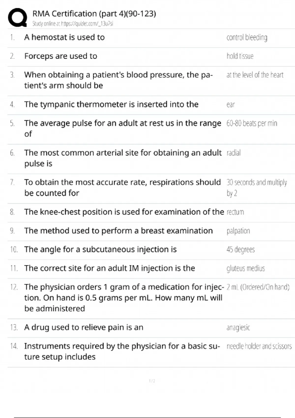 Ace Part 4 (Questions 90-123) of your Registered Medical Assistant (RMA) certification exam with this comprehensive 2025 practice test and study guide. This essential resource covers key clinical and administrative topics: pharmacology basics, medication administration, patient communication, medical law, and office procedures. Designed for medical assistants, these verified questions and answers will help you master essential healthcare competencies, improve patient care skills, and build the confidence needed to score 100% on your RMA certification test.