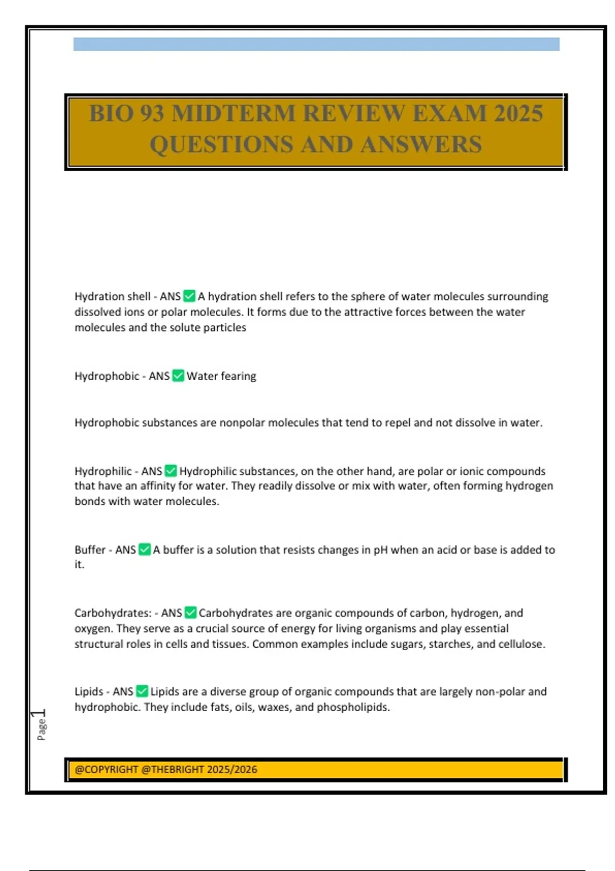 Hydration shell - ANS A hydration shell refers to the sphere of water molecules surrounding dissolved ions or polar molecules. It forms due to the attractive forces between the water molecules and the solute particles Hydrophobic - ANS Water fearing Hydrophobic substances are nonpolar molecules that tend to repel and not dissolve in water. Hydrophilic - ANS Hydrophilic substances, on the other hand, are polar or ionic compounds that have an affinity for water. They readily dissolve or mix with water, often forming hydrogen bonds with water molecules. Buffer - ANS A buffer is a solution that resists changes in pH when an acid or base is added to it. Carbohydrates: - ANS Carbohydrates are organic compounds of carbon, hydrogen, and oxygen. They serve as a crucial source of energy for living organisms and play essential structural roles in cells and tissues. Common examples include sugars, starches, and cellulose. Lipids - ANS Lipids are a diverse group of organic compounds that are largely non-polar and hydrophobic. They include fats, oils, waxes, and phospholipids. BIO 93 MIDTERM REVIEW EXAM 2025 QUESTIONS AND ANSWERS @COPYRIGHT @THEBRIGHT 2025/2026 Page2 Proteins - ANS Proteins are complex macromolecules composed of amino acids linked together through peptide bonds. DNA: - ANS DNA, or deoxyribonucleic acid, is a molecule that carries genetic information in living cells. It consists of two long chains of nucleotides twisted into a double helix. ATGC Amino acids - ANS Amino acids are organic compounds that serve as the building blocks of proteins. Osmosis - ANS Osmosis is the spontaneous movement of a solvent, typically water, through a semipermeable membrane from a lower solute concentration region to a higher solute concentration region Pick the properties of life from the options below (select all that apply). - ANS Order Energy processing Regulation Which of the following statements is a true sequence about the emergent properties theme? - ANS Organs → tissues → cells → organelles → molecules The emergent properties theme represents the hierarchical arrangement of biological organization in living organisms, from the most complex structures down to the fundamental components. In this case, the sequence is The Biosphere → Ecosystems → Communities → Populations → Organisms → Organs → Tissues → Cells → Organelles → Molecules. All cells share common characteristics - ANS 1. Enclosed by a membrane 2. Use DNA as geneti