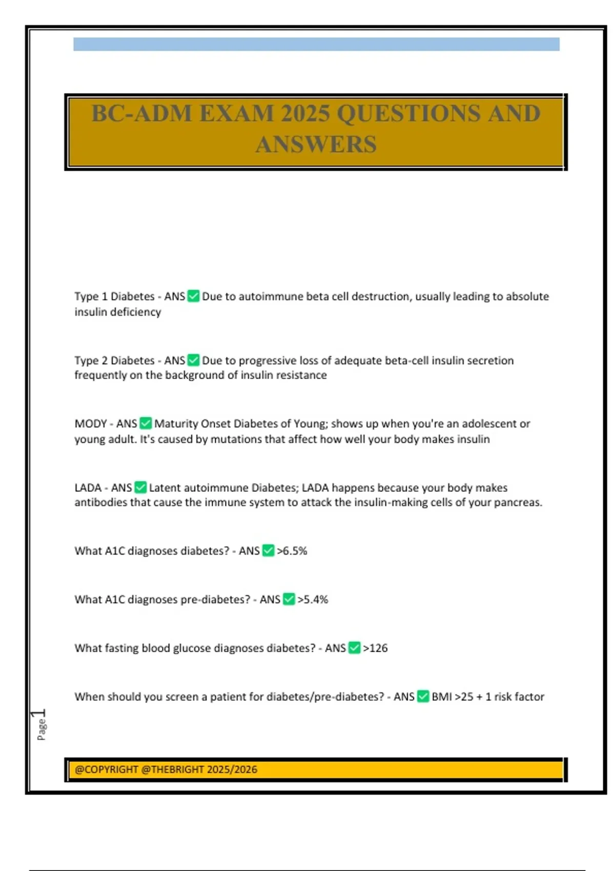 Type 1 Diabetes - ANS Due to autoimmune beta cell destruction, usually leading to absolute insulin deficiency Type 2 Diabetes - ANS Due to progressive loss of adequate beta-cell insulin secretion frequently on the background of insulin resistance MODY - ANS Maturity Onset Diabetes of Young; shows up when you're an adolescent or young adult. It's caused by mutations that affect how well your body makes insulin LADA - ANS Latent autoimmune Diabetes; LADA happens because your body makes antibodies that cause the immune system to attack the insulin-making cells of your pancreas. What A1C diagnoses diabetes? - ANS >6.5% What A1C diagnoses pre-diabetes? - ANS >5.4% What fasting blood glucose diagnoses diabetes? - ANS >126 When should you screen a patient for diabetes/pre-diabetes? - ANS BMI >25 + 1 risk factor BC-ADM EXAM 2025 QUESTIONS AND ANSWERS @COPYRIGHT @THEBRIGHT 2025/2026 Page2 At what age should "healthy" patients start being screened? - ANS 45 years old How frequently should patients be tested? - ANS Every 3 years How frequently should well controlled diabetes be checked? - ANS Every 6 months How frequently should uncontrolled diabetes be checked? - ANS Every 3 months At what point should kids be screened for diabetes? - ANS >85th percentile + 1 risk factor (FH, GDM mom, etc) What medications can cause diabetes? - ANS Steroids HIV meds Atypical antipsychotics Thiazide diuretics What are risk factors for gestational diabetes? - ANS Overweight/Obese FH of diabetes Previous birth >9 lbs Age >25 When does ge