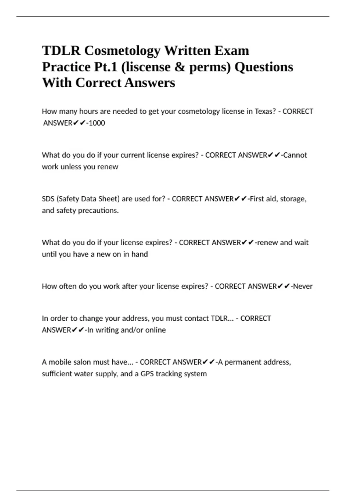 TDLR Cosmetology Written Exam Practice Pt.1 (liscense & perms) Questions With Correct Answers