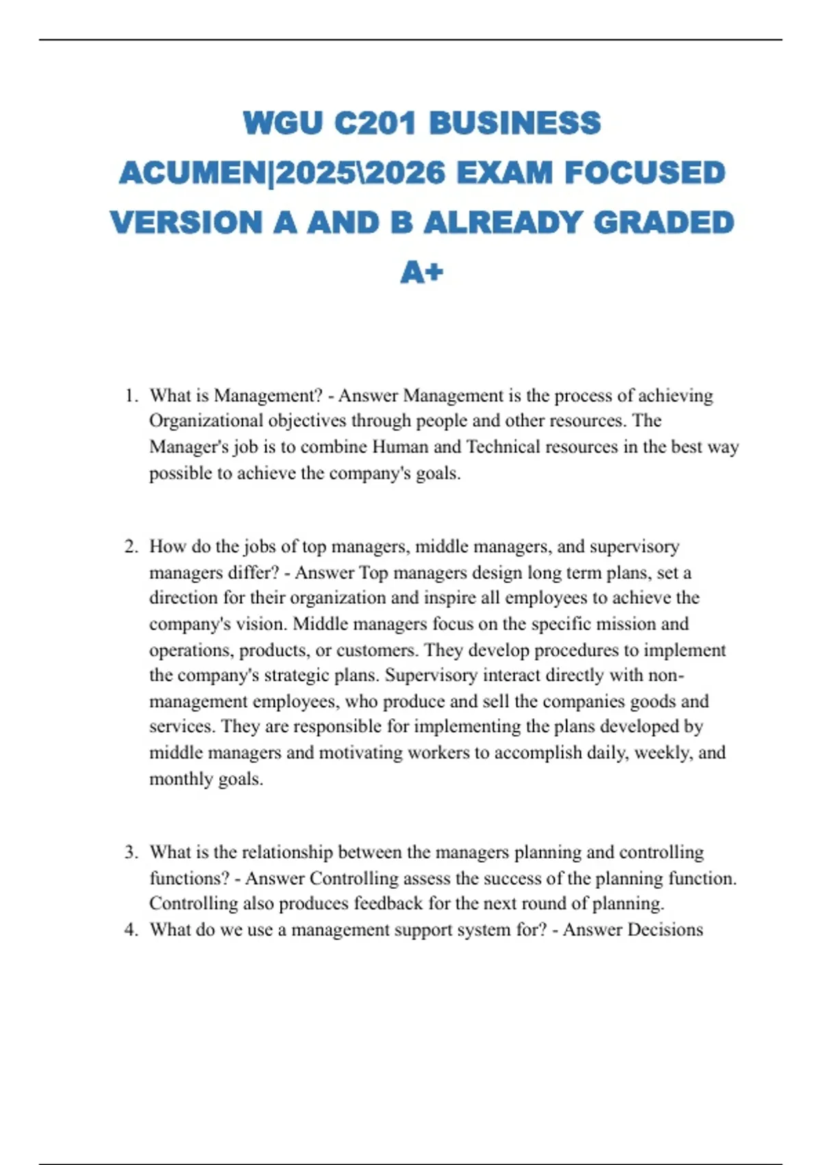 WGU C201 BUSINESS ACUMEN| EXAM FOCUSED VERSION A AND B ALREADY GRADED A+ 1. What is Management? - Answer Management is the process of achieving Organizational objectives through people and other resources. The Manager's job is to combine Human and Technical resources in the best way possible to achieve the company's goals. 2. How do the jobs of top managers, middle managers, and supervisory managers differ? - Answer Top managers design long term plans, set a direction for their organization and inspire all employees to achieve the company's vision. Middle managers focus on the specific mission and operations, products, or customers. They develop procedures to implement the company's strategic plans. Supervisory interact directly with non-management employees, who produce and sell the companies goods and services. They are responsible for implementing the plans developed by middle managers and motivating workers to accomplish daily, weekly, and monthly goals. 3. What is the relationship between the managers planning and controlling functions? - Answer Controlling assess the success of the planning function. Controlling also produces feedback for the next round of planning. 4. What do we use a management support system for? - Answer Decisions 5. Marketing - Answer Organizational function and set of processes for creating, communicating, and delivering value to customers and for managing customer relationships in ways that benefit the organization and its stakeholders. 6. How marketing creates utility - Answer Marketing creates the "want satisfying power" of goods and services by researching what will provide form utility, time, place, or ownership utility. 7. Eras of marketing - Answer Marketing has evolved from the production era, to the sales era, followed by the marketing era, and the current stage, the relationship era. 8. Emergence of the marketing concept - Answer Company wide customer orientation with the objective of achieving long-run success. The basic idea of the marketing concept is that marketplace success begins with the customer. A firm should analyze each customer's needs and then work backward to offer products that fulfill them. 9. Not-for-profit marketing - Answer Both public and private not-for-profit organizations employ marketing strategies to reach audiences, secure funding, improve their images, and accomplish their overall missions. 10. Nontraditional marketing - Answer Person, place, event, cause, and organization marketing are examples of marketing efforts that go beyond traditional product-oriented appeals.They are used primarily by the not-for-profit sector, but also have gained increased use in private businesses. 11. Marketing strategy - Answer A two-step process that begins with the study and analysis of potential target markets. The second step is the creation of a marketing mix to satisfy the chosen market. 12. Market - Answer People with needs and wants, purchasing power, and the willingness and authority to buy.Markets are usually classified as consumer (B2C) or business (B2B) markets. 13. Selecting a target market - Answer The target market is the group of potential customers towards whom an organization directs its marketing efforts. 14. Marketing mix - Answer Blending of the four elements of marketing strategy: product, distribution, promotion, and pricing. The proper marketing mix aims to satisfy chosen customer segments. 15. Developing marketing mix for International markets - Answer Marketing a good or service in foreign markets, deciding whether to offer the same mix in every market-standardization, or to develop a unique mix to fit each market- adaptation 16. Marketing research - Answer The process of collecting and evaluating information to help marketers make effective decisions. 17. Obtaining marketing research data - Answer Internal data such as financial records, inventory level reports, and sales and profitability statements are useful examples.External is from outside sources. Secondary data, or previously published data, are low-cost and easy to obtain. Federal, state, and local government publications are excellent data sources.Primary data is collected firsthand through such methods as observation and surveys. 18. Applying marketing research data - Answer Includes business intelligence, which uses various activities and technologies to gather, store, and analyze data to make better competitive decisions. 19. Data mining - Answer Computer searches of customer data to detect patterns and relationships using a data warehouse, which is acustomer database that allows managers to combine data from several different organizational functions. 20. Market segmentation - Answer Dividing a market into several relatively homogeneous groups. Both profit-seeking and not-for-profit organizations use segmentation to help them reach desirable target markets. Market segmentation is often based on the results of research, which attempts to identify trends among certain groups of people. 21. How it works - Answer First, the firm must determine if it's offering B2B or B2C market. 22. Segmenting consumer markets - Answer Four common bases for segmenting consumer markets are geographical, demographic, psychographic, and product-related segmentation. 23. Segmenting business markets - Answer Business markets can be segmented into three categories: customer-based segmentation, end-use segmentation, and geographical segmentation. 24. Consumer behavior - Answer Actions of ultimate consumers directly involved in obtaining, consuming, and disposing of products and the decision processes that precede and follow these actions. 25. Determinants of consumer behavior - Answer Include individual needs and motives, perceptions, attitudes, learned experiences, and self-concept. 26. Determinants of business buying 27. behavior - Answer Business buyers face a variety of organizational influences, and these decisions often involve the combined judgment of people from many areas