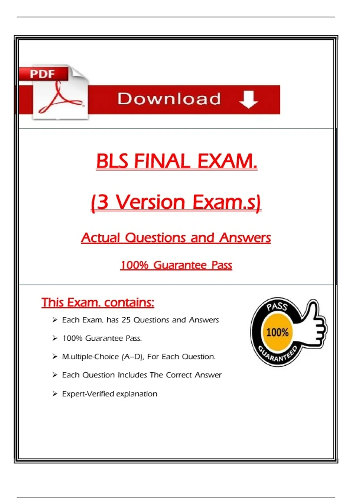 Pass Your (2025 / 2026) BLS Final Exam with (3 Version Exams) Qs and Ans with Explanation, Verified Revised Full Exam BLS Final Exam (2025 / 2026) Qs and Ans with Explanation, Verified Revised Full Exam 1. BLS Final Exam Questions and Answers 2025 with detailed explanations 2. Verified BLS exam answers for 2025 with rationales 3. Updated BLS Final Exam study guide with practice questions 4. Comprehensive BLS test prep materials for 2025/2026 5. BLS certification exam tips and tricks for passing 6. Latest BLS algorithm changes for 2025 final exam 7. BLS Final Exam sample questions with answer key 8. How to prepare for BLS Final Exam 2026 in advance 9. BLS Final Exam practice tests with instant feedback 10. Common mistakes to avoid on BLS Final Exam 2025 11. BLS Final Exam review course with verified answers 12. Step-by-step BLS exam answer explanations for 2026 13. BLS Final Exam study strategies for guaranteed success 14. Revised BLS protocols for 2025/2026 certification exam 15. BLS Final Exam question bank with updated content 16. Expert-verified BLS exam answers for 2025 certification 17. BLS Final Exam study materials aligned with 2026 guidelines 18. Comprehensive BLS Final Exam review with practice scenarios 19. BLS exam preparation timeline for 2025/2026 certification 20. BLS Final Exam mock tests with performance analysis 21. Key concepts for BLS Final Exam 2025 success 22. BLS Final Exam study group resources for 2026 23. Interactive BLS exam prep tools for 2025/2026 certification 24. BLS Final Exam cheat sheet with verified information American Red Cross BLS, BLS final exam, BLS test preparation, CPR certification, Basic Life Support exam, BLS practice questions, verified exam answers, BLS study guide, 2025 BLS exam, 2026 BLS exam, BLS exam questions and answers, BLS exam explanations, American Red Cross certification, online BLS course, BLS review materials, first aid training, emergency response training, lifesaving techniques, healthcare provider BLS, BLS training resources, pass BLS certification, study tips for BLS, BLS knowledge assessment, BLS exam tips, test your BLS knowledge, BLS certification requirements, comprehensive BLS exam guide, effective BLS preparation, BLS mock exam, BLS exam success strategies.
