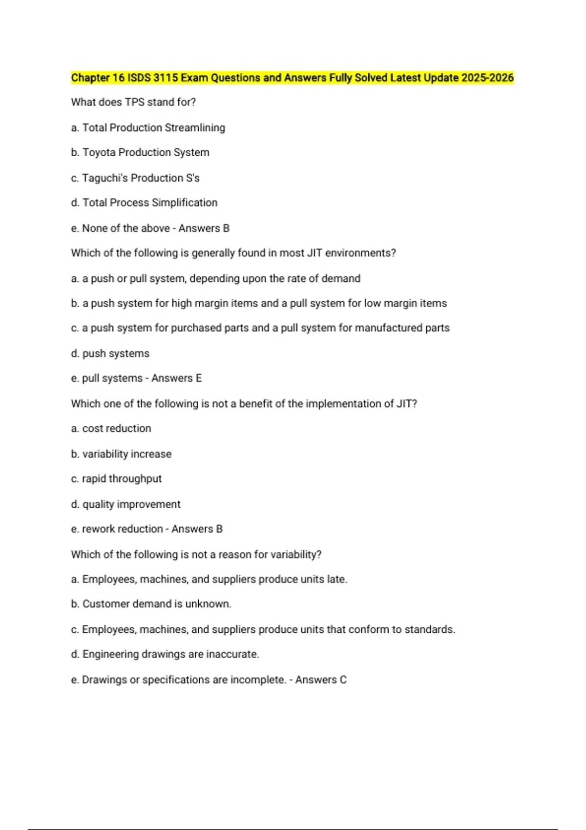 Chapter 16 ISDS 3115 Exam Questions and Answers Fully Solved Latest Update What does TPS stand for? a. Total Production Streamlining b. Toyota Production System c. Taguchi's Production S's d. Total Process Simplification e. None of the above - Answers B Which of the following is generally found in most JIT environments? a. a push or pull system, depending upon the rate of demand b. a push system for high margin items and a pull system for low margin items c. a push system for purchased parts and a pull system for manufactured parts d. push systems e. pull systems - Answers E Which one of the following is not a benefit of the implementation of JIT? a. cost reduction b. variability increase c. rapid throughput d. quality improvement e. rework reduction - Answers B Which of the following is not a reason for variability? a. Employees, machines, and suppliers produce units late. b. Customer demand is unknown. c. Employees, machines, and suppliers produce units that conform to standards. d. Engineering drawings are inaccurate. e. Drawings or specifications are incomplete. - Answers C Which of the following is specifically characterized by a focus on continuous improvement, respect for people, and standard work practices? a. Just-in-time (JIT) b. Toyota Production System (TPS) c. Lean operations d. Material requirements planning (MRP) e. kanban - Answers B Which of the following is specifically characterized by continuous and forced problem solving via a focus on throughput and reduced inventory? a. Just-in-time (JIT) b. Toyota Production System (TPS) c. Lean operations d. Material requirements planning (MRP) e. kanban - Answers A Which of the following statements regarding a pull system is true? a. Large lots are pulled from upstream stations. b. Work is pulled to the downstream stations before it is actually needed. c. Manufacturing cycle time is increased. d. Problems become more obvious. e. None of the above is true of a pull system. - Answers D Manufacturing cycle time is best defined as the a. length of the work shift, expressed in minutes per day b. time it takes a unit to move from one workstation to the next c. time between the start of one unit and the start of the next unit d. sum of all the task times to make one unit of a product e. time from raw materials receipt to finished product exit - Answers E If the goals of JIT partnerships are met, which of the following is a result? a. For incoming